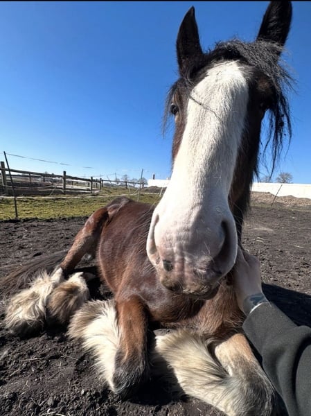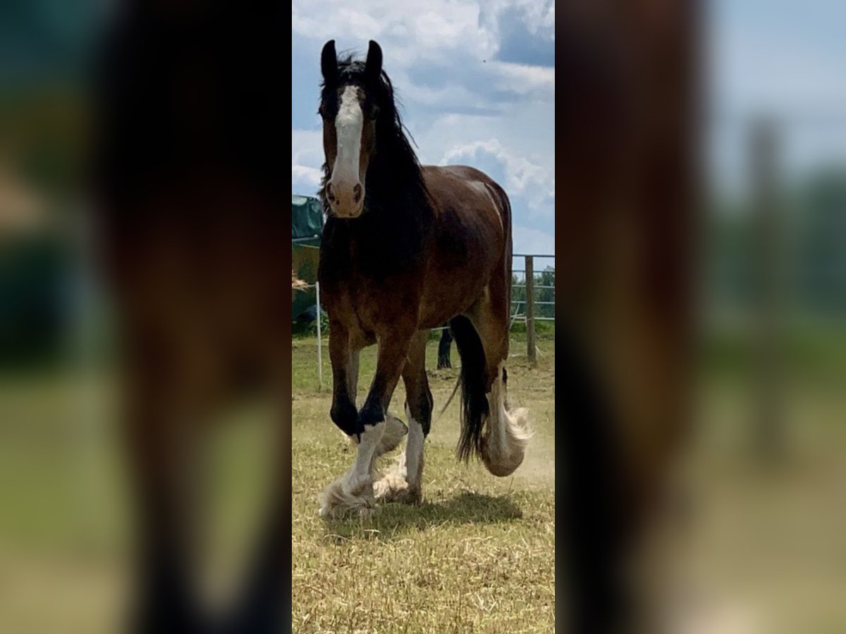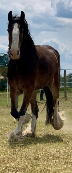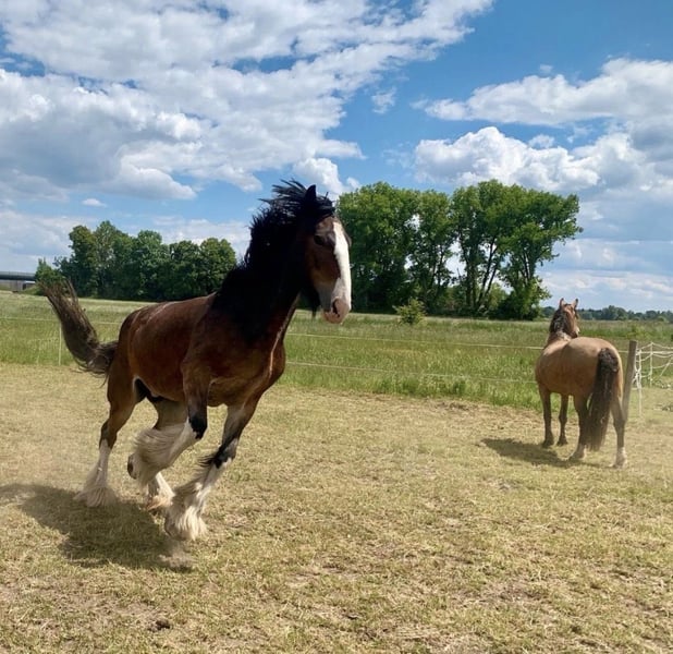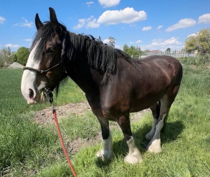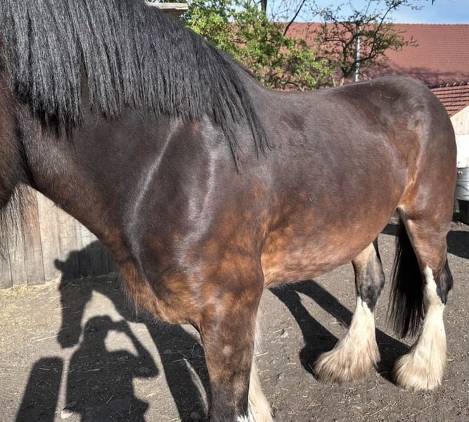 Shire Horse Stute, geb. 2019, ca. 1,70 m – sensibel, menschenbezogen & mit viel Potenzial Schweren Herzens - Aufgrund veränderter Umstände suche ich für meine Shire Horse Stute ein passendes, langfristiges Zuhause. Kein Notverkauf. Sie ist eine sehr liebe, verschmuste und sensible Stute, die eine enge Bindung zum Menschen aufbaut. Im Umgang zeigt sie sich freundlich, aufmerksam und gut händelbar. Im Wesen ist sie eher ruhig und gemütlich, zeigt aber bei Spiel und Motivation auch schöne, schwungvolle Bewegung. Sie ist sehr aufmerksam, lernwillig und fein in der Kommunikation – bei klarer, ruhiger Führung baut sie schnell Vertrauen auf und orientiert sich stark am Menschen. Sie ist gut erzogen, halfterführig und lässt sich problemlos anbinden sowie alleine stehen. Hufschmied und Tierarzt sind kein Problem, insbesondere mit vertrauter Bezugsperson. Im Alltag zeigt sie sich absolut unkompliziert: – kennt Hunde, andere Tiere, Kinder (liebt sie) und Straßenverkehr – bleibt auch in ungewohnter Umgebung ruhig (z. B. Autobahnbrücke) – lässt sich problemlos waschen/abspritzen – kennt Decke, Fliegenhaube und Spray Alleine spazieren gehen ist problemlos möglich. Sie kennt Bodenarbeit und wird aktuell schonend an das Reiten sowie an das Einspannen herangeführt. Satteln und Gurt sind ihr bekannt, sie kennt bereits Reitergewicht. Sie wächst im Herdenverband auf, ist ranghoch, aber fair und sehr verträglich. Offenstall sowie Box mit Paddock sind ihr bekannt – sie hält die Box sauber und macht zuverlässig draußen. Kein reines Anfängerpferd – bei ruhiger, klarer Führung jedoch sehr kooperativ. Barhuf, gesund. SHS Papiere Braun mit vier weißen Abzeichen an den Beinen und schönem Behang Freizeit, Gelände, später auch für Arbeit oder Gespann interessant. Transport ist gegen Aufpreis möglich. Zubehör kann ebenfalls gegen Aufpreis übernommen werden. Big Sunshine Margie - Braun Vater: Decoy Prince Charming - Rappe Mutter: Brickell Eileen - Braun