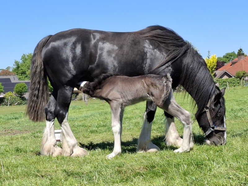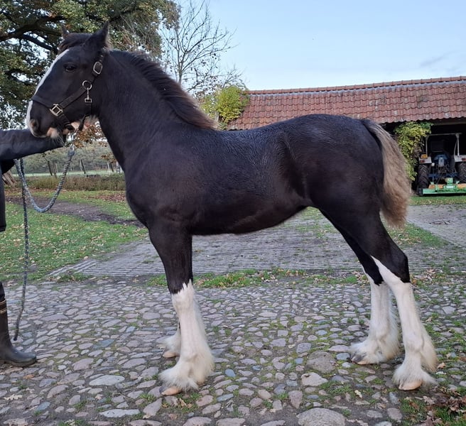 Schwarze Shire-Stute Fohlen zu verkaufen, 4 weiße Abzeichen mit einer schönen Blesur. Die Mutter ist Five Hills Taffy Rose (schwarz) von Five Hills Jesse (schwarz); der Vater ist Five Hills Knutsford Edward (schwarz) von Old Croft Sergio (schwarz). Brynn verfügt über schöne, lockere Gänge; sie hat Charakter und Ausstrahlung. Sie hat bereits an der Shire-Show in Lunteren teilgenommen und wurde Reserve-Champion bei den Fohlen.