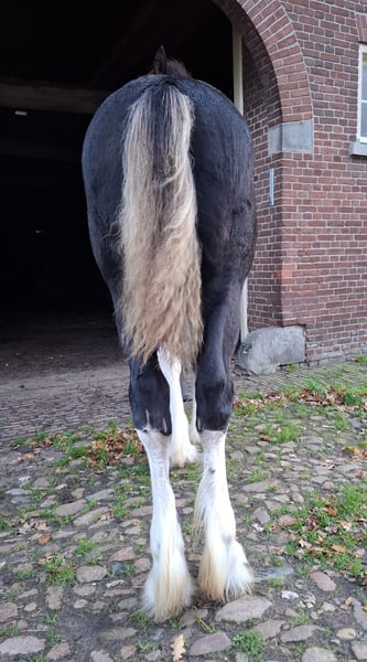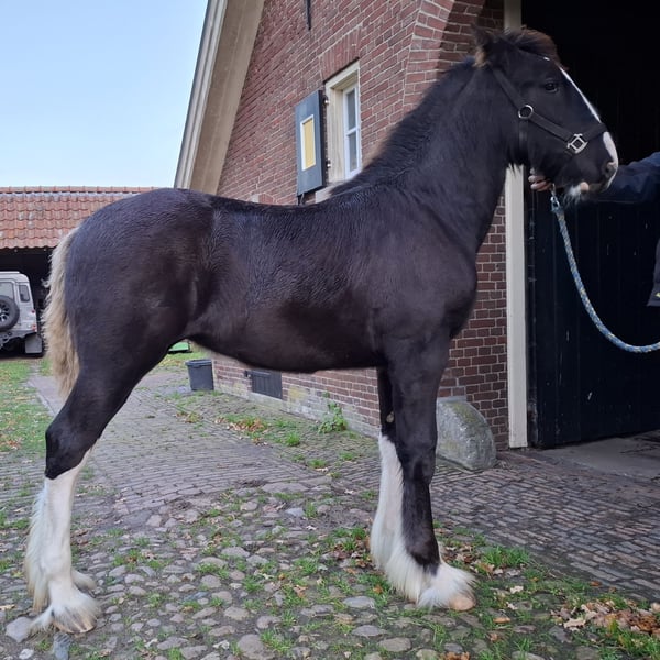 Yegua potra Shire negra en venta, con 4 años, de color blanco con una hermosa mancha; la madre es Five Hills Taffy Rose (negra), hija de Five Hills Jesse (negro); el padre es Five Hills Knutsford Edward (negro), hijo de Old Croft Sergio (negro). Brynn tiene movimientos sueltos y elegantes; posee carácter y presencia; ya ha participado en la exposición de Shire en Lunteren, donde fue subcampeona entre las potras.