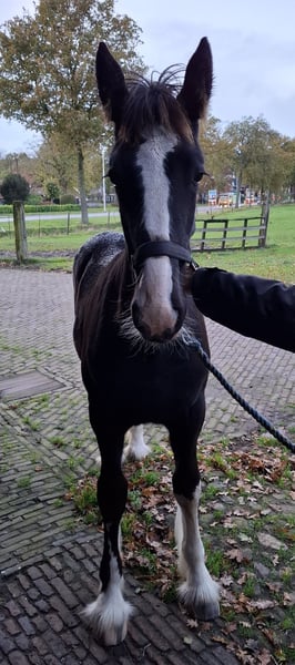 Zwart Shire merrie veulen te koop, 4 wit met een mooie bles; moeder is Five Hills Taffy Rose (zwart)van Five Hills Jesse (zwart); vader is Five Hills Knutsford Edward (zwart) van Old Croft Sergio (zwart). Brynn heeft mooie losse gangen; ze heeft karakter en uitstraling; reeds meegedaan met de Shire show in Lunteren waar ze reservekampioen bij de veulens is geworden.