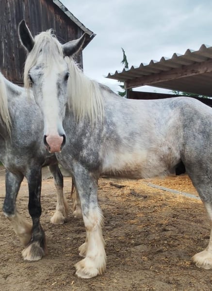 Numero Due urodził się na wiosnę 2022 roku i jest wyjątkowym młodym wałachem rasy Shire Horse. Pochodzi z naszej własnej hodowli i od urodzenia był otaczany dużą troską i miłością. Oba jego rodzice wyróżniają się przyjaznym, zrównoważonym charakterem – i właśnie te cechy odzwierciedla również Numero Due. Jest niezwykle przywiązany do ludzi i czuły, aktywnie poszukuje kontaktu, chętnie przyjmuje głaskanie i uwielbia spacery. Ponadto jest ciekawy świata, otwarty i chętny do poznawania nowości. Wychował się w mieszanej grupie na rozległych pastwiskach, co zapewniło mu dobre umiejętności społeczne i równowagę emocjonalną. Niestety, u Numero Due zdiagnozowano dysplazję stawu śródstawowego. Dla niewtajemniczonych: polega to na obniżeniu stawu nadkłykciowego – obszaru powyżej kopyta – co powoduje, że jego kończyna jest nieco bardziej miękka w osi kończyny, przez co nie nadaje się do jazdy. Mimo tej szczególnej cechy, porusza się w stadzie płynnie i nie wykazuje żadnych ograniczeń w codziennym życiu. Ze względu na tę specyficzną wadę zdrowotną, Numero Due jest oferowany znacznie poniżej swojej wartości rynkowej – zamiast 5900 € cena wynosi 2500 €. Szukamy dla niego domu u ludzi, którzy docenią jego czuły charakter i zapewnią mu spokojne, stabilne życie jako koń towarzyszący lub podopieczny. Uwielbia towarzystwo innych koni, jest społeczny, lubi się bawić, jest łatwy w obsłudze i obdarza swoich opiekunów pełnym zaufaniem. Dla osoby, która chce mieć przy boku drugiego lub trzeciego konia jako przyjaciela, Numero Due będzie idealny. Doskonale nadaje się również dla osób szukających konia do „kochania”, spacerów czy jako koń do towarzystwa – według weterynarza ruch jest dla niego szczególnie korzystny. Numero Due jest prowadzi się na halterze, zna stanowisko do czyszczenia, pielęgnację kopyt i ma już pierwsze pozytywne doświadczenia z przewozem w przyczepie. Podczas wizyt u weterynarza i kowala zachowuje się spokojnie i bezproblemowo. Nie kuleje i w grupie zachowuje się wzorowo. W stadzie jest pełen energii i ciekawości – dlatego nie jest odpowiedni jako koń towarzyszący starszym koniom, ale świetnie sprawdzi się jako kompan dla młodszych lub równie aktywnych zwierząt. Możemy go także wyobrazić sobie jako towarzysza dla spokojnego, nie dominującego ogiera. Chcielibyśmy podkreślić, że nie jest to sprzedaż w nagłym przypadku. Numero Due może pozostać u nas do czasu znalezienia odpowiedniego domu. Zależy nam, aby był tam doceniany takim, jakim jest – jako kochający, nie jeżdżący koń towarzyszący, z dużym sercem i łagodnym usposobieniem. Dla nas liczy się raczej miejsce niż cena, dlatego chętnie otrzymamy krótkie opisanie przyszłego domu. Numer Due mieszka obecnie w pobliżu Ried im Innkreis. Na życzenie chętnie prześlemy dodatkowe informacje, zdjęcia lub filmy oraz umówimy się na spotkanie. Jeśli chcesz podarować młodemu, kochanemu wałachowi Shire Horse z wyjątkową historią nowy dom, Numero Due będzie wiernym towarzyszem na długie lata.