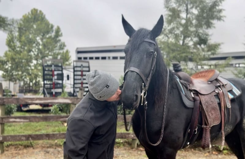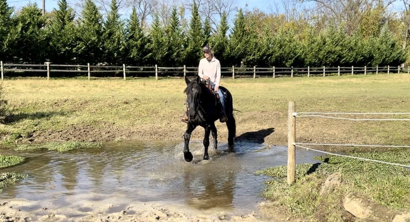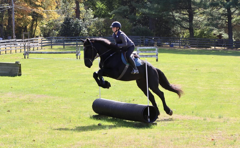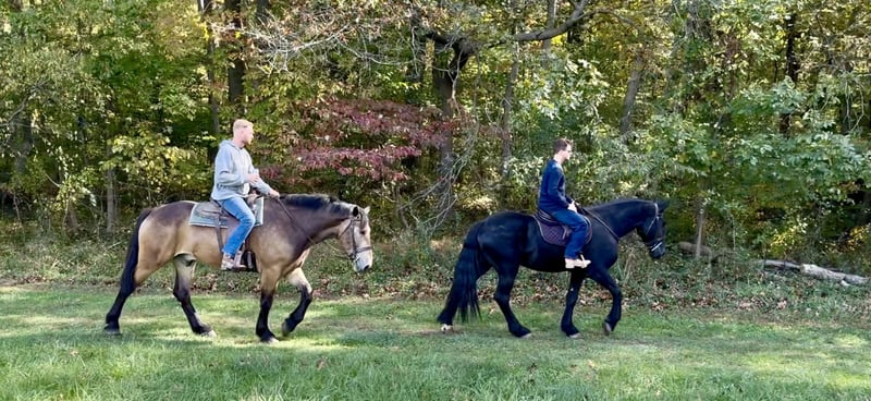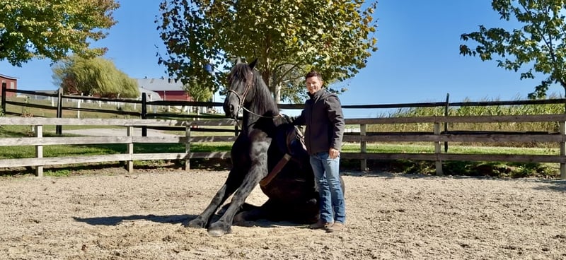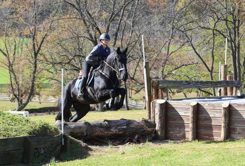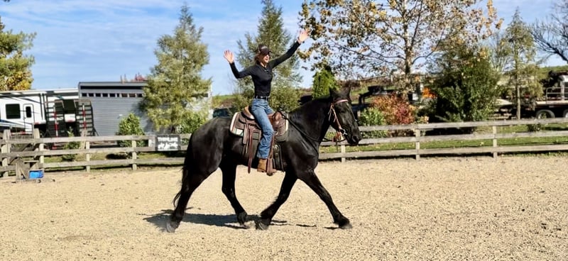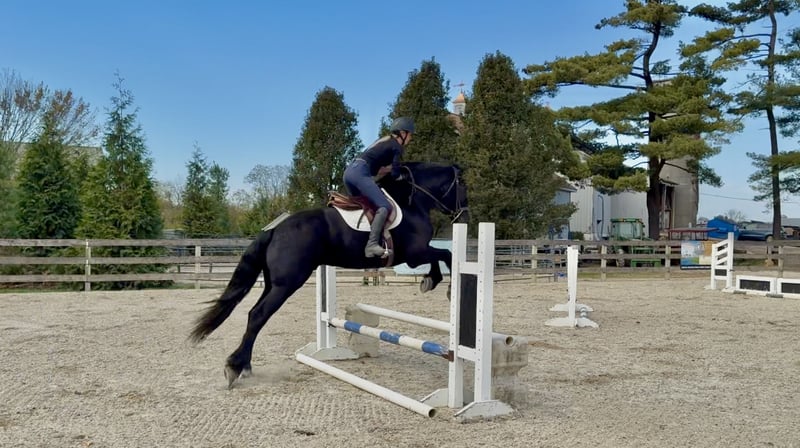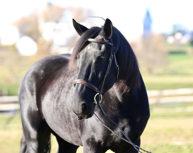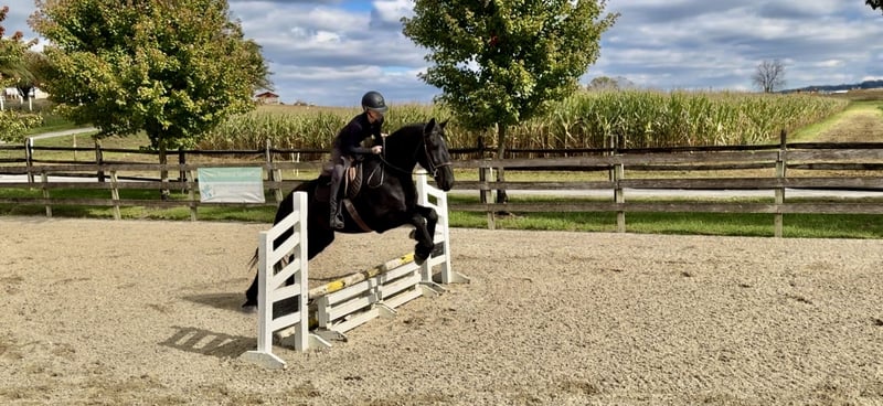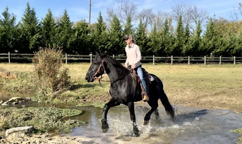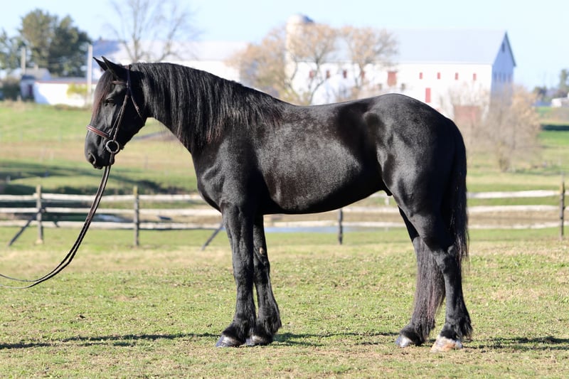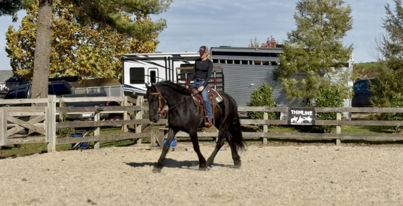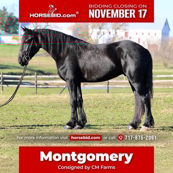 🎲𝓽𝓱𝓮 𝐑𝐈𝐃𝐄𝐑'𝐒 𝓒𝓱𝓸𝓲𝓬𝓮🎲 Happening now thru MONDAY | NOVEMBER 17th - Available EXCLUSIVELY on HorseBid's website! For more details and to register visit: www.Horsebid.com CONSIGNOR CONTACT: CM Farms 717-875-2061 LOCATION: Gap, PA BREED: Shire/Friesian/QHx REGISTERED: No REGISTERED NAME: Montgomery COLOR: Black HEIGHT: 16.2 AGE: 4 GENDER: Gelding Meet ✨Montgomery✨ a four year-old, 16.2 hand, Shire/Friesian/QH cross gelding. This well put together man has the sweetest temperament and has quickly made himself a barn favorite! Monty is also interchangeably known as Whiskers and Mustache around our barn. No, seriously- he probably has a better mustache than most of the men in your life…😂 -And while the mustache definitely makes him stand out, his overall sweet demeanor, safe mind, and talent under saddle and harness is what truly makes him stand out. He is wise beyond his years and was simply born quiet. He rides both Western and English, and drives both single and double. This boy even knows some tricks; he will lay down and sit like a dog on command! Monty has been started slowly and correctly under saddle. Exposed to a variety of different environments and disciplines, without anything being drilled or overdone. He is smart, athletic, a nice mover, and he can continue to go any direction and succeed. When people talk about wanting the perfect “in-between” draft cross that can still be athletic while having substance- this guy is what they’re describing. He’s sturdy, sure footed, a floaty mover, and a comfortable ride! He’s been on many trail rides to ensure a good foundation to his education. We would argue that he is already quite the trail master! He just tackled a hunter pace last weekend, and we couldn’t have asked him to do a better job. You can put him anywhere in the group and he’ll happily go along on a loose rein. He is very courageous and will lead even better than some of the older horses! He has a calm, quiet personality, and has proven to be incredibly brave. Monty has flown through our desensitization program like it was a breeze. He doesn’t mind the tarp, flag, smoke, equipment, traffic, dogs (and other various animals)- and he’s even walked through fire without batting an eye. You can ride him right to town without having a worry in the world. He’s even gone through the Chipotle drive-thru to pick up lunch! Monty is quite the guy, and once he gets to know you, he will be your best friend. He’s the type of horse that will bond with you, and once you have his trust, he will do anything for you! All it takes to win Monty over is a handful of treats and a soft gentle touch. He is a sensitive soul that is a once in a lifetime horse. In the ring, Monty has a nice walk trot and canter both directions. He’s responsive, forward thinking and a quick learner. You never have to ask him twice. His trot is adjustable. He moves off of leg, and he’s just starting to learn going on the bit and doing more collection work. His transitions are coming along incredibly well, and he has the best brakes with just a “whoa” or a sit back. He neck reins and direct reins, and once you get done riding and hop off of him, he will follow you around like a puppy- no lead rope needed! This superstar has been lightly started over jumps, both in the ring and cross country. He even did some coops on the pace! He is so naturally talented with his form, technique, and spatial awareness. He has the cutest knees over jumps (seriously look at the pictures) and endless scope! He doesn’t get rushy or hot. You can jump around, and then come back down and walk on a loose rein. If someone continues him in this direction, the options are endless! In the barn, Monty is always respectful and easy to handle. He stands on the cross ties or straight tie and will stand as still as a statue as long as you want him to. He’s quiet to both groom and tack up, and seems to love the attention. He’s behaved in his stall and for the vet and farrier. He loads right into the trailer and turns out in a mixed herd. We all adore our mustache around here--and we want the best home for him. If it weren’t for a full barn and an already large collection of personal horses, Caleb has sworn he’d be keeping him for himself! If you’re looking for a young prospect with zero vices, a sound mind, and the ability to go any direction do not pass up on this special gelding. UTD on shots farrier dentist and coggins- PPEs welcome