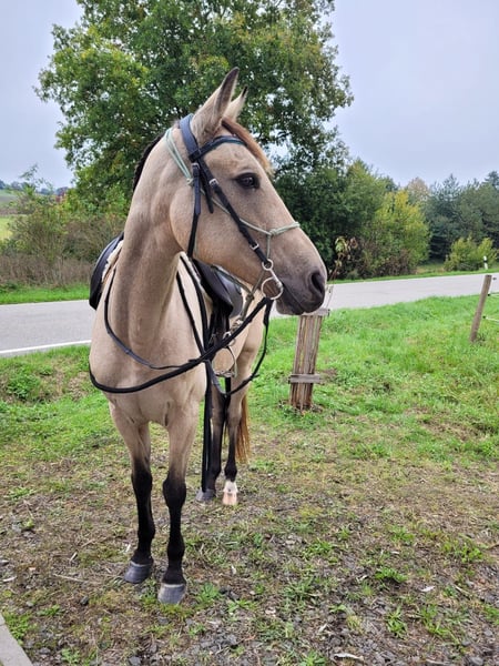 Our hardworking, butter-soft Speed Racker mare, a four-gaited horse with a clear tölt, in stunning BUCKSKIN coat. Self-cleaning coat😉 beautiful, athletic, fast, and secure. Healthy, no allergies except for a past sensitivity to grass mites, which is easily treated. We have already ridden her in Germany, Mallorca, the USA, and the Pyrenees in France. - Age: 10 years - Height: 15.9 hh - Gaits: four-gaited, no pace - Farrier- and load-safe, excellent hooves, barefoot since arriving in Europe. Registered with RHBAA and SHOBA, and listed in the pre-registration of the Rhineland Breeding Association. She is familiar with dogs and water, traffic-safe, and characterized by sure-footedness, courage, and a close bond with people. Walking speed: 7.2 km/h (she can naturally go slower) or can accompany other horses at their pace. Unfortunately, she cannot easily tölt at very high speeds, but she enjoys galloping very much. For trail riding, a steady pace is preferable over speed. Always close to her rider. She has never had issues with the saddle or pressure from the girth, despite her sensitivity. Now she is looking for her joyful "forever human" to explore the world together. Currently in training. Trial ride: €30 More information: Facebook Thomas: https://bit.ly/ts2269 Facebook Iren: https://bit.ly/ir0873 Gwen – Finos & Friends Tournament, first time in the arena: https://rebrand.ly/Gwen1 Gwen – tölt test, 2nd place: https://rebrand.ly/Gwen1a Gwen and her video presentation for the US SHOBA Association: https://rebrand.ly/Gwen1b Gwen and Thomas: https://rebrand.ly/Gwen1c