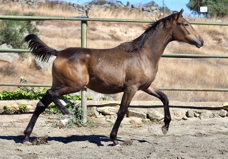 Esta excepcional potra baya, resultado de una mezcla única entre una madre KWPN de 1.80 m de alzada y un semental Perla español PRE de 1.69 m, destaca por sus extraordinarios movimientos y su elegante morfología. Con una estructura física impecable, presenta excelentes aplomos y cascos, lo que la convierte en una opción ideal tanto para la doma como para otras disciplinas. Su genética combina lo mejor de dos mundos: la potencia y la altura de los KWPN con la nobleza y el carácter del PRE, asegurando un futuro prometedor para quienes busquen una potra con gran proyección y calidad.