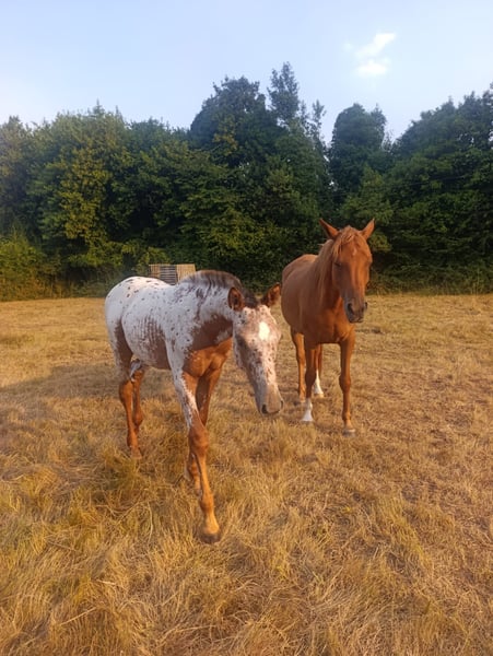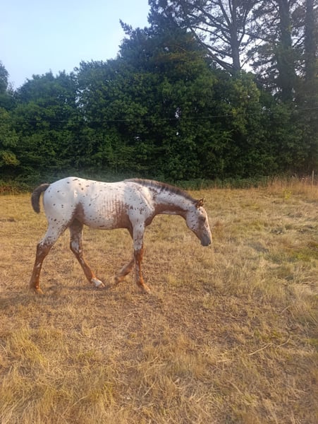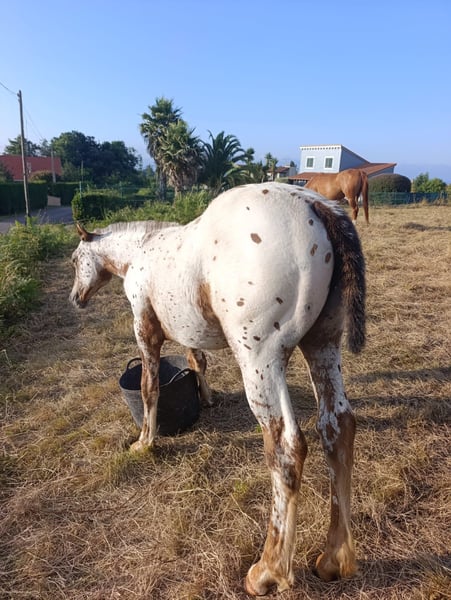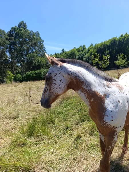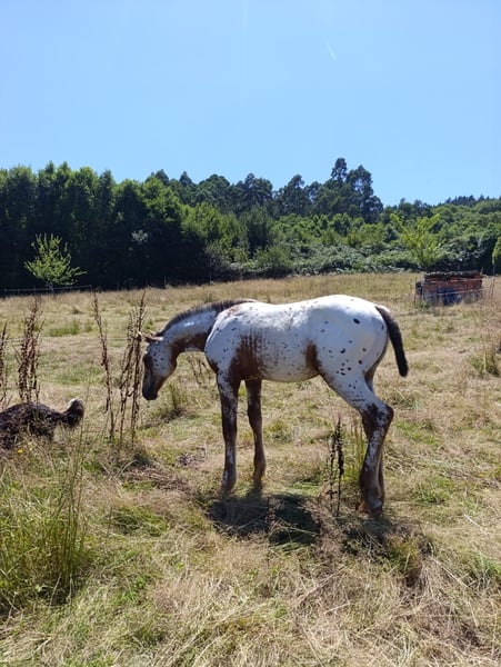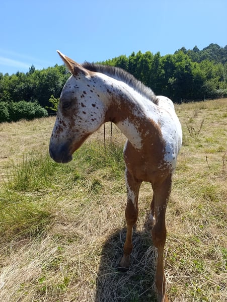 Ar Jannah. Beautiful Appaloosa filly with a base coat of chestnut. Filly with a good character, she allows herself to be touched and has been loaded into a trailer. She comes from a line of show jumping competitors. Her father is Matfrey, from the El Tiempo Stud. Her mother, Jaleo 12.5%, a breeding mare, won a free jumping competition at 2 years old. Her maternal grandfather is Mr. Cartano, a recognized horse that competed in show jumping and has had recognized descendants.