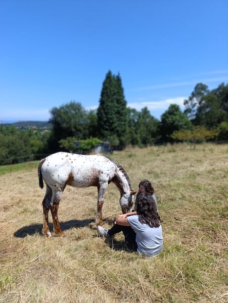 Ar Jannah. Wunderschöne Appaloosa-Stute mit Basis in Fuchs. Stute mit gutem Charakter, lässt sich anfassen und wurde bereits im Anhänger transportiert. Sie stammt aus einer Linie von Springpferden. Ihr Vater ist Matfrey von der Zucht El Tiempo. Ihre Mutter, Jaleo 12,5%, Zuchtstute, gewann mit 2 Jahren einen Wettbewerb im Freispringen. Ihr mütterlicher Großvater ist Mr. Cartano, ein anerkannter Hengst, der im Springen konkurrierte und viele anerkannte Nachkommen hatte.