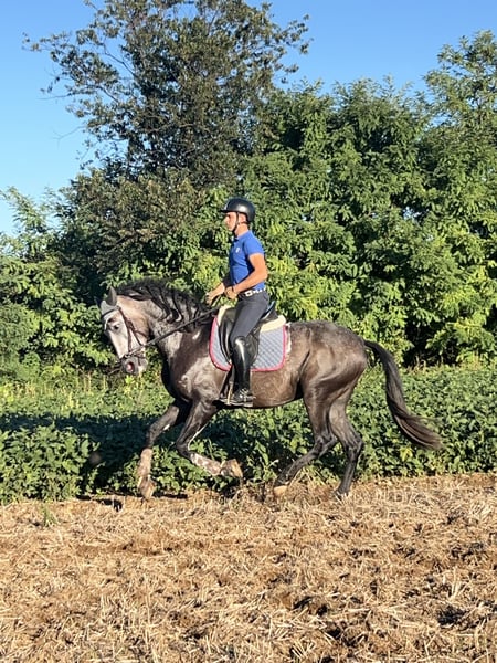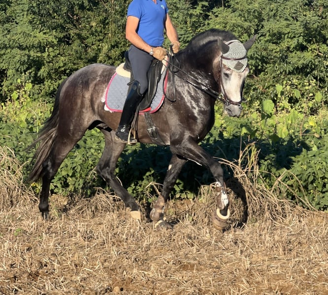 CDE (Spanish Sport Horse), a cross between PRE and Holsteiner, with purebred documentation. He is 10 years old, gelded, and stands at 16.1 hh at the withers. He has an excellent conformation, an impressive presence, and a very gentle, playful, and well-trained demeanor up to M/D level. He has competed successfully in FISE competitions. He performs shoulder-in, half-pass, pirouettes at walk and canter, simple and flying changes, including series (up to two tempi). Easy to handle with bridle and bit, suitable for hacking, making him ideal for amateurs or those learning. Available for any test or inspection.