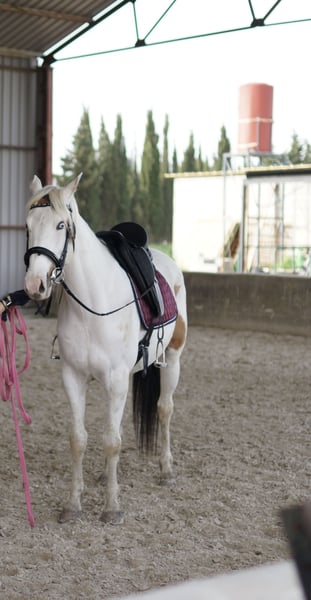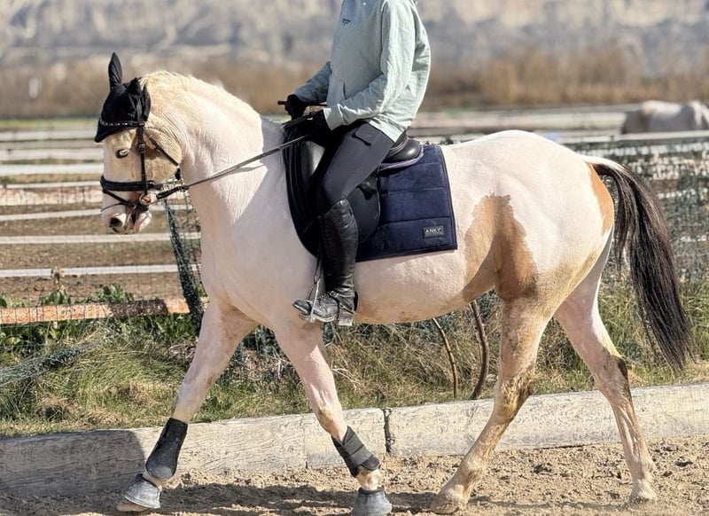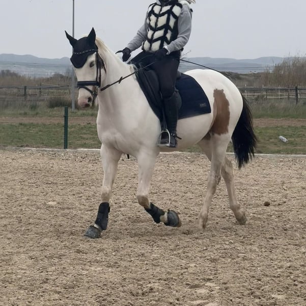 ¡Oportunidad de venta de caballo de deporte! La Capa pío blanca, con manchas marrones y un ojo marrón y otro azul y la cola negra hacen que sea un capricho. Bien montado, ideal para todo tipo de jinetes. Este ejemplar, castrado, nació en el año 2020 y cuenta con una alzada de 158 cm. Paso, trote, galope, espalda adentro, grupa adentro, cesiones. Sale al campo. También ha pasado alguna cruzada. Destaca por su carácter, muy tranquilo y noble. No hace un mal gesto. Sin problemas para herrar, subir al van y esquilar. Lo vendo porque económicamente ya no puedo mantenerlo.