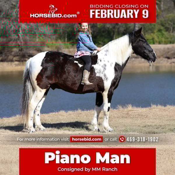 ❤️🔥𝑩𝒆 𝑴𝒊𝒏𝒆 𝐒𝐄𝐋𝐄𝐂𝐓❤️🔥 Happening now thru MONDAY | FEBRUARY 9th - Available EXCLUSIVELY on HorseBid's website! For more details and to register visit: www.Horsebid.com CONSIGNOR CONTACT: MM Ranch 469-318-1902 LOCATION: Forney, TX BREED: Spotted Saddle horse REGISTERED: No REGISTERED NAME: Piano Man COLOR: Pinto HEIGHT: 14.2 AGE: 8 GENDER: Gelding 🎼 🎵 🎶 Piano Man is a good honest all around trail horse. He is the kind that is bombproof for absolutely anyone to ride. He is kid tested and grandparents approved. He has been rode by ages 4 yrs old to 85 yrs old. He is a been there done that type. A well seasoned horse with thousands of miles under his belt. He is the perfect size of 14.2 hands tall. Not too big not too small! And he is the perfect age of 8 yrs old. (Vet confirmed on age). 🎵Piano Man is a spotted saddle bred horse (gaited horse). If you don’t know about the breed I encourage you to look them up. It’s not a prancy or hyper gait. Not quick. It’s a natural more laid back gentle gait. He will walk or you can easily kick him up to his gait. He will go both slow or fast. You just set the speed to your liking. He is super easy to get gaiting but as soon as you are done he will drop right back down into a walk. It’s kinda of liking putting your car on cruise control. He will do the rest. He is a super smoooooth ride!!!! And oh so easy and fun. If you have back or hip issues and need a comfortable ride this is him. He is a short stout made horse that has plenty of foot and bone. Piano is trail riders dream horse. He is a true gentleman to be around on the ground. He is a very well mannered gelding. He stands tied at the trailer, stands for farrier, vet, and bathes well. He stalls well, and enjoys turn out time. He gets along with other horse well. He's is very brave and takes everything you expose him to in stride. 🎹 Piano will cross whatever you come to water, bridges, deadfall, wildlife, and traffic. We have been through rocky terrain, had him around gunfire, tarps, city lights, and cattle, all of which he has handled very well. You cannot rattle him or stir him up. He is a pro. 🎶 Piano has a true one hand neck rein, and is very light in the mouth. He backs up with ease. He rides out alone just fine. Not at all buddy sour or herd soured. Not at all hyper. I can’t stress that enough. Other gaited horses I have been around seem to want to go all the time. That is not him. He will gait when told then walk the rest of the time. You wouldn’t even know he is gaited till you speed him up. 🎼 We have used him to check our cattle 😂 yes surprisingly he likes working cattle and being around them. We have took him on many mountain rides through all types of terrain. He is a seasoned real deal trail horse. We have let the kids ride him through town. Absolutely nothing phases this guy. Not at all spooky or watchy. No bad habits at all. Absolutely no buck or silliness when riding him. 🎹 Piano is a super easy keeper. Requires no maintenance of any kind. He can go barefoot or put shoes on him. You can stall him or turn him out. Doesn’t matter to him. He is easy. PLUS he sells 100% sounds with no health issues. He did have a pre vet evaluation done included in the pictures. If you have anymore questions about him feel free to call. We would love to visit with you about him. We can help you arrange shipping anywhere. He is up to date on all vaccinations, worming, had his teeth checked, feet. He is ready to go to his new home.