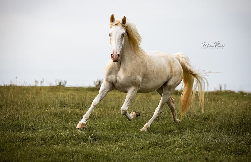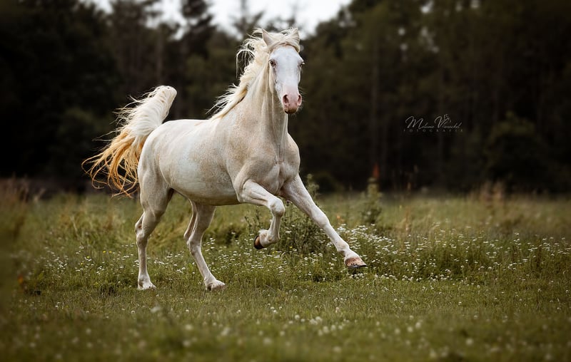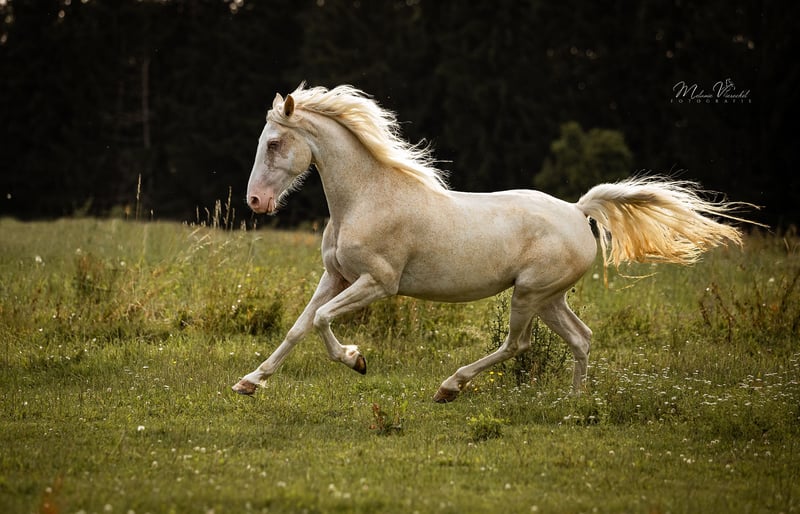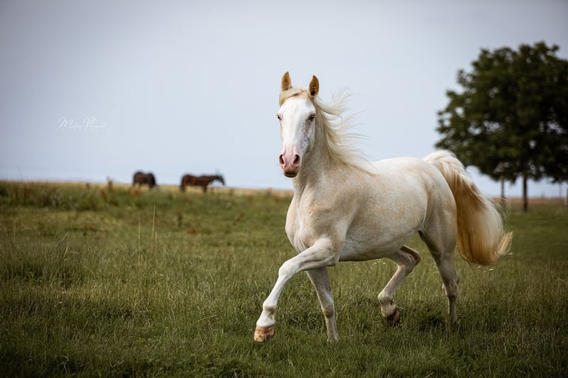 Sterling’s Last Stand, bei uns liebevoll „Penny“ genannt, ist eine fleißige Stute, die sich sowohl in der Zucht als auch als Reitpferd bewährt hat. Sie hat bei uns zwei Fohlen zur Welt gebracht und überzeugt ebenso unter dem Sattel durch ihre angenehme Art. Als Tennessee Walking Horse ist sie etwas ganz Besonderes: Sie bringt sowohl Walk- als auch Rack-Veranlagung mit. Bei uns wurde sie im Tölt ausgebildet, zeigt jedoch weiterhin deutlich ihre natürliche Walk-Veranlagung, die sich sicher noch weiter ausbauen lässt. Penny verfügt über schwungvolle, ausdrucksstarke Gänge mit einem besonders raumgreifenden Schritt und Trab sowie einen leicht abrufbaren, taktklaren Naturtölt. Im Umgang zeigt sie sich ausgesprochen freundlich, menschenbezogen und verschmust. Durch ihr ausgeglichenes Wesen wurde sie auch bei Kursen gerne von Besuchern geritten und stets sehr geschätzt. Eine vielseitige und unkomplizierte Stute, die sowohl im täglichen Umgang als auch unter dem Reiter viel Freude bereitet. Auch farblich ist als Fuchs Sabino mit Champagnergen etwas besonderes. Ein Pferd, mit dem man auf jeden Fall auffallen wird, ob als Reit- oder Zuchtpferd. Sie wird mit klinischer Ankaufsuntersuchung verkauft und kann jederzeit gerne kennengelernt und probegeritten werden.