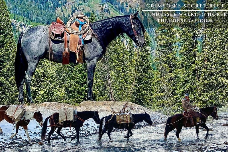 Blue is a 2019, 15hh, blue roan, smooth-gaited, registered Tenneses walker. He’s been a ranch Favorite by everyone since the day we brought him home 3 years ago. There’s not much Blue hasn’t done; from chasing Grizzly bears to riding in the big Fourth of July parade, nothing seems to faze him. He’s packed; elk, bighorn sheep, mountain lions, little children, grandmas, and everything you could ever want. He’s led the pack string or can go anywhere in it. Blues is the perfect family horse. He’s suitable for beginners, children, and experienced riders alike. He adjusts his energy to match his rider, making even the most inexperienced rider comfortable. Blue can travel at the pace of a slower breed or really move out with the gaited crowd. Blue’s gait is beer-drinking smooth and is really fun to cover country. He’s been in lots of rough country and is extremely sure-footed. We live in the middle of the Rocky Mountains, so when I say rough, I mean it, down timber, ice, mud, bogs, dogs, ditches, shallows, rivers, snow, bikes, and anything you can imagine. Blues never fazed. The Cody Wy Fourth of July parade is one of the bigger ones in the country, and Blue was selected as an outrider’s horse and didn’t shirk the task. He handled all the commotion from helicopters, marching bands, fire trucks, and floats wonderfully. He’s fun to ride bareback in a halter and always clutch in the heat of the moment. Our girls have been known to catch him and ride him bareback in a halter by themselves with OUT permission lol. He’s a trustworthy babysitter. Blues never offered to buck or run off, he catches you in the pasture, is a dream to shoe, saddle, bridle, and be around—absolutely no vices. My family and I live on a private ranch in Wyoming just outside of Yellowstone National Park. We don’t just come to visit; we live in the mountains, making our living from our horses. They are exposed to wildlife and the elements every day. We’re NOT traders! We only offer a couple of our best horses each year, and lucky for you, this is Blue’s year. There’s sure to be some wet eyes when Blue leaves, but they always end up at wonderful homes, and new friends are made. There’s no “gotcha” with Blue if you don’t see something, it’s because I forgot to put it in. Bid with confidence on this once-in-a-lifetime gelding.