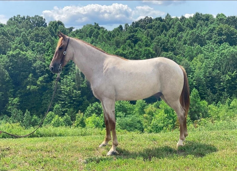 Redington Steel aka Steele Man is a 4yr old registered red roan gelding that stands 15.1hh. I cannot say enough good things about this guy. Steele man has been ridden many miles in the Big South Fork, as well as the beaches of Florida. For a 4 year old horse, he has been put through the obstacles, on overnight camping trips and is willing to please. This nice young gelding is suitable for almost any level rider. He will walk on a loose rein all day, or step up and ride when asked. He has no problem riding out alone or in large groups. Steele Man will carry your saddle bags, chain saw, or anything you need and still ride just the same. He is focused on one thing, and that’s his job. He isn’t gun shy, and as you can see from the video is not shy from loud noises or tarps. We have threw firecrackers, and other large fireworks off of Steele Man, and he did nothing but a small flinch as shown. ATVS, Motorcycles, and other farm equipment do not bother him. Steele man is the kind of guy you can take out an enjoy all day, or throw your non horse friends on and not have to worry about. He has no problem crossing creeks, steep hills or large ditches. He is a gentleman for mount and dismount, and will stand until asked to step off. He stands to be bathed, clipped and for the farrier. Steele Man has all the looks, color and brains you could ask for, all wrapped up in a young horse to last a lifetime
