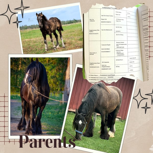 Meet this handsome young colt, born in September 2024, expected to grow to around 155 cm / 15hh. From day one, he’s shown a gentle and curious nature – a truly easy-going companion in every way. Born in September 2024, expected to mature around 155 cm / 15hh. 🐴✨ Arthur stands 13 hh/ 135cm as an 13 month old. This lovely boy has a very friendly and easy temperament, making him a pleasure to handle and work with. ✅ Health & Care: PSSM n/n; G/n (additional genetic tests available on request) DNA verified breeding, recorded in an Irish Cob Passport (FSIC ry) Healthy, vaccinated, dewormed, and regularly trimmed He is well-handled, can live both in a stable or electric-fenced paddock without issues. If you’re looking for a kind-hearted young colt with great potential, he’s the one! Located in Estonia, with transport available worldwide.