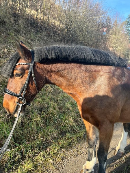 A very sweet mare is looking for her forever home! I am hoping to find someone who can offer her the best life with patience and calmness. She is very gentle in handling, knows no bad habits, and is easy to manage with both the farrier and the veterinarian. She is familiar with trailer loading, although she still needs some practice. She requires a trusting handler, as she is initially somewhat shy and sensitive. However, she blossoms with time. Her favorite activity is hacking out; she can even go on a canter! But she also enjoys long walks at a relaxed pace to unwind and enjoy the scenery. Arena work was a foreign concept to her at first, but we have gradually learned the basics, and she always wants to do her best, showing herself to be a clever little mare. I believe she could learn much more with the right person! She enjoys free jumping, lunging, and long-lining, listening well to voice commands. Of course, she can also sometimes get a bit spirited and give a little gas. Therefore, I am looking for an experienced horse person, as she is still a small, sensitive pony mare with her own head—never malicious. Clear rules and boundaries should be established, or she might try to take control herself. Regarding mud fever: She came to me with mud fever but is now in excellent condition. We have always consulted with the veterinarian. She is vaccinated, has had regular blood tests, and shows no signs of injuries. It’s difficult for me because we have achieved a lot together and learned from each other, but I am only about 1.70 meters tall, and my weight is no longer sustainable for her. Plus, she’s simply too nice to be sold off. If you’re interested, please don’t hesitate to get in touch!