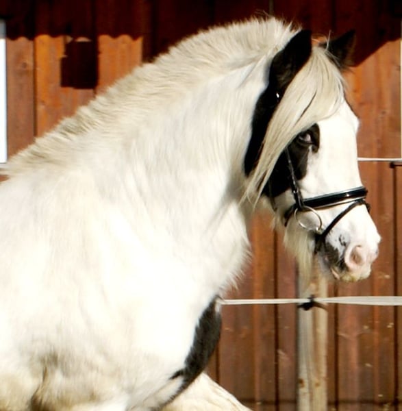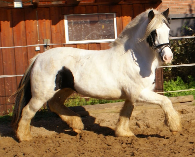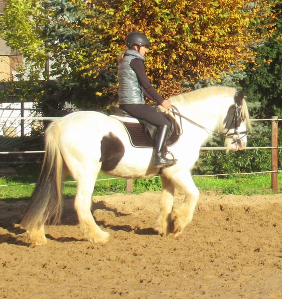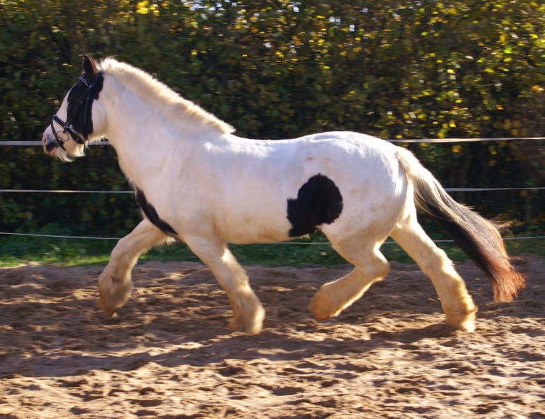 Wonderful Rappscheck Tinker mare, 15 years old, 14.7 hands, with a blue eye. Well-behaved both in handling and under saddle, easy to ride, with a lively, athletic movement. No lameness or mud fever. She is familiar with dogs and tractors, not spooky, and stands well for the farrier and loading.