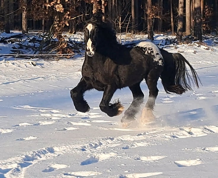 For sale: Tinker mare – Perfect for leisure riding! We are offering a beautiful Tinker mare, born in 2023. She impresses with her striking tobiano coat pattern (Smokey Black Appaloosa with tiger striped saddle blanket) and a friendly temperament. With a height of approximately 15.2 hands [still growing], she is ideally suited for recreational riding, shows, or breeding. The mare is healthy, well-socialized, and exhibits a very gentle nature in handling. Sold only with a final stable placement due to health reasons. This is not a distressed sale. Papers are from the ICS. Whether for long walks or simply to fall in love with – this young Tinker lady is a wonderful companion for anyone seeking a reliable and charming leisure horse. I have already led her around in walk with my daughter, and she remains calm. Otherwise, she is still quite raw, as she is still in her growth phase and needs time and care. Overall, she is very level-headed. Please feel free to contact me for further information or if you are interested!