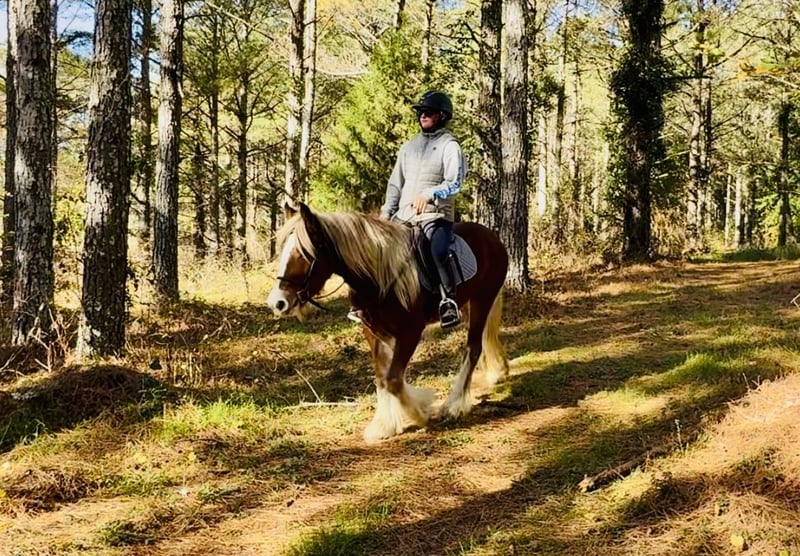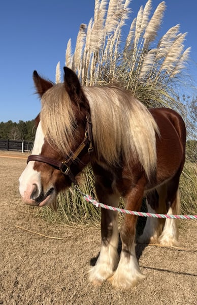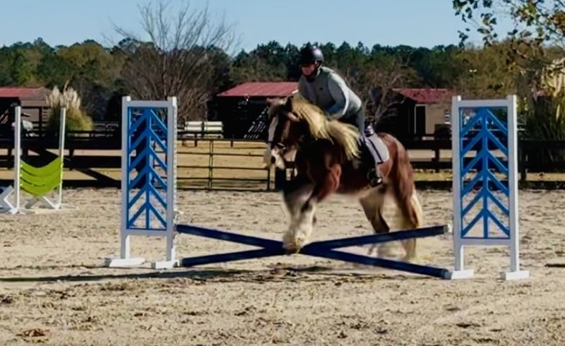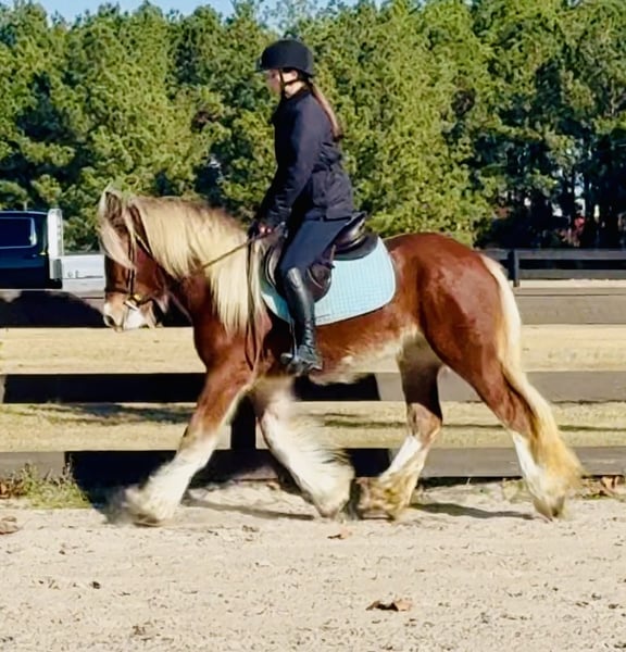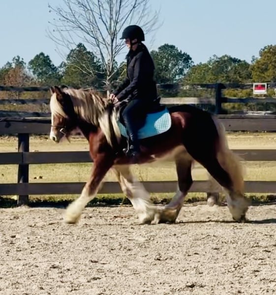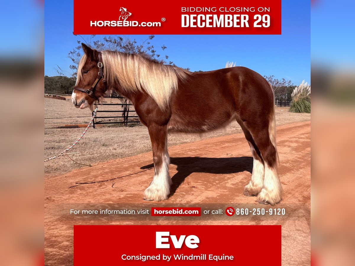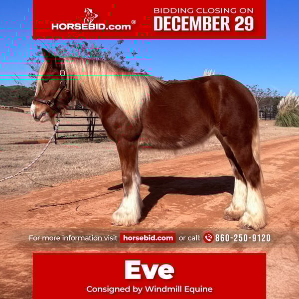 ⚜️𝐓𝐇𝐄 𝓗𝓮𝓻𝓲𝓽𝓪𝓰𝓮 𝐖𝐢𝐧𝐭𝐞𝐫 𝓒𝓵𝓪𝓼𝓼𝓲𝓬⚜️ Happening now thru MONDAY | DECEMBER 29th - Available EXCLUSIVELY on HorseBid's website! For more details and to register visit: www.Horsebid.com CONSIGNOR CONTACT: Windmill Equine 860-250-9120 LOCATION: Johnston, SC BREED: Gypsy Vanner REGISTERED: No COLOR: Chestnut HEIGHT: 13.3 AGE: 3 GENDER: Mare Eve is a 3yo 13.3h Gypsy Vanner mare. Now don’t let her age fool you, she is 3 going on 13. She is unique and different and definitely something we do not get in very often, but this girl is so so special. In the barn she is quiet and respectful. She is easy to catch, groom, bathe, clip and saddle. In the ring she is probably the best riding horse you will find. She had a slow and correct start. She has gone through all the motions with all types of flat work. She has three super super easy and very comfortable gaits. She is super light in the bridle and will even come around to the bridle like a show horse. She has a great whoa, easy neck rein and she moves off your leg easy too. She has just been started over fences and is jumping cross rails easily and willingly. Her changes are started and coming along nicely too. Out of the ring she rides like your best trail horse. She leads the way, she follows, she takes charge in the scariest situations. She is dog and traffic safe and she crosses bridges and jumps logs. She is so brave and truly nothing phases her. We know she drives, but we do not have a harness or cart to try. We cannot say enough good things about this girl, she is definitely the entire package. She is still growing too so she will get taller and wider. She has no blemishes, no vices, no behavioral issues, she is truly perfect in every way. Whoever ends up with her will for sure have one of the best, most eye catching horses wherever they go.