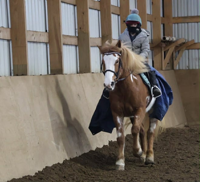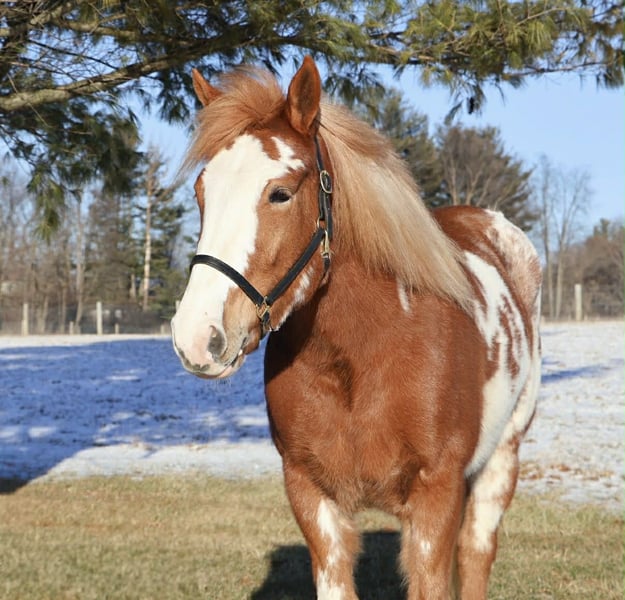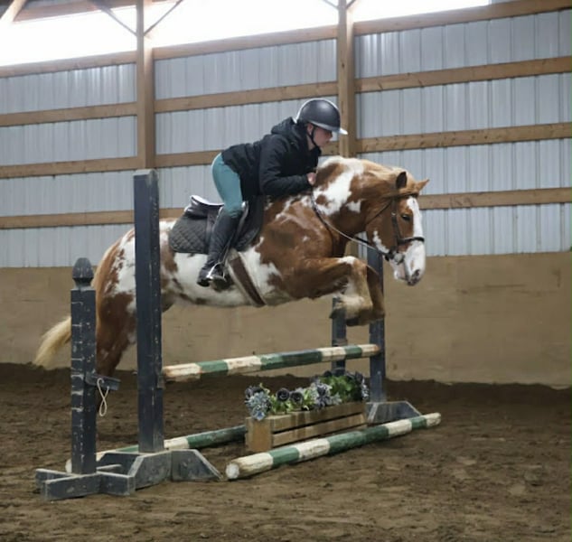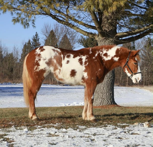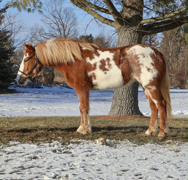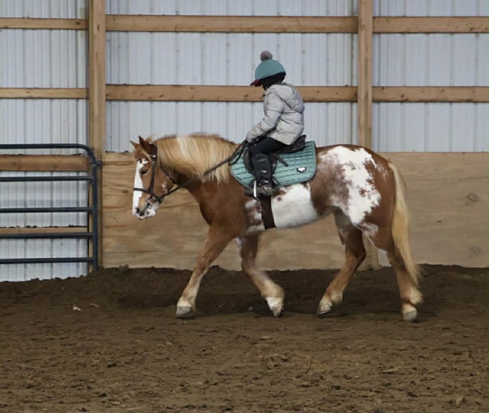 "AVAILABLE ON ONLINE HORSE AUCTION AT www DOT PlatinumEquineAuction DOT com BIDDING OPEN NOW thru SUNDAY | MARCH 1ST! *Final price will be determined on auction site* CONSIGNOR CONTACT INFO: Ellesse Schwartz 248-390-6831 LOCATION: Howell, MI Get ready for your perfect match! This sweetheart is hands down one of the most beautiful gypsy vanner Haflinger crosses you will meet. This little lady stands 14.1hh at 4 years old. She’s got a stunning chestnut and white overo coloring covering her coat. Light feathering on all 4 legs, the most stunning thick strawberry mane and tail. Her conformation is very classic and correct. Splash has a petite and pretty face with a kind and expressive eye. Splash is full of personality in a good way. She knows all the liberty work and will lay down on command! She's carried the flag, steeps over tarps, bridges and plays with the giant ball! She can say yes and no and side pass right over to the mounting block! This little lady is always happy to greet you and will stand for hours for grooming. She has had 60 days in harness and has driven across the countryside of Michigan. Under-saddle this girl is a blast!! She walk, trots, and canters with comfort and ease. She comes equipped with effortless transitions both upward and down. She stops on a dime and backs up like a pro. Splash moves very well off of seat and leg pressure as well. She has been working in the arena schooling 1st level dressage moves and works with ease and elegance. She’s a smart girl, once you teach her something she gets it’s and comes out the next day aiming to please. We have been having a blast jumping her. Splash is jumping small courses in beautiful form and she’s not one to shy from flowers or fill. She holds a nice canter around a course and jumps in great form. Splash has spent many hours out on the trails and she loves an adventure. She will ride out alone or in a group. She comes equipped with an effortless next rein. She’s not phased by cracking brush, thick woods, dirt road traffic, wildlife, steep hills or water. With that being said we think she would be super fun to take out on a hunter pace, or even some lower level eventing. Splash is a very special girl. She has been ridden independently by kids as young as 5 and adults in their 70s her comfortable gaits and steady pace make her a favorite among all. She’s got the movement, mind, and looks to go almost any direction you want to take her! Splash lives in Howell, MI. Please call or text Ellesse Schwartz 248-390-6831for more info.