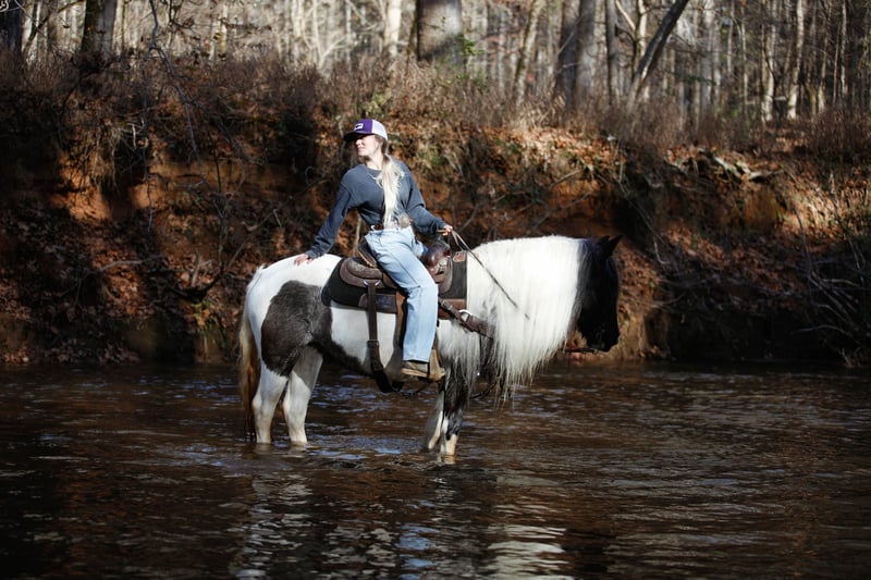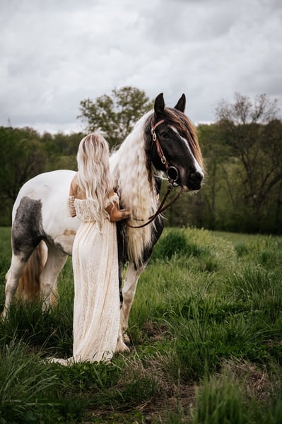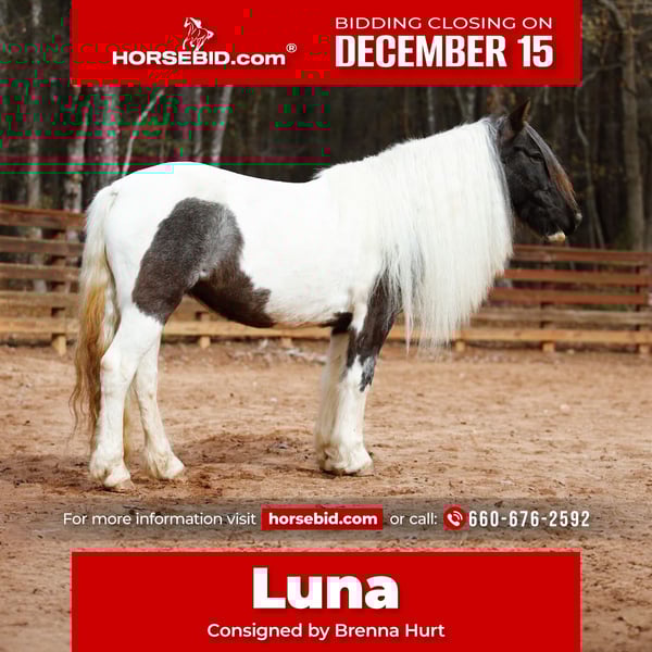 🎄𝐓𝐇𝐄 𝑯𝒐𝒍𝒊𝒅𝒂𝒚 𝐂𝐋𝐀𝐒𝐒𝐈𝐂🎄 Happening now thru MONDAY | DECEMBER 15th - Available EXCLUSIVELY on HorseBid's website! For more details and to register visit: www.Horsebid.com CONSIGNOR CONTACT: Brenna Hurt 660-676-2592 LOCATION: Rutledge, GA BREED: Gypsy Sport Horse REGISTERED: Yes REGISTERED NAME: ML FARMS LUNA COLOR: Blue Roan Tobiano HEIGHT: 14.1 AGE: 6 GENDER: Mare It is absolutely my pleasure to introduce you to the most beautiful, unique, intelligent, and sweet horse I have ever owned! Luna is a six year old, Blue Roan Tobiano, Registered Gypsy Sport Horse mare. Gosh I’m not even sure where to start honestly. Every second of having this gorgeous girl has been an absolute joy. From the day she came to me I have been absolutely enamored by her, and so has everyone else that has ever came in contact with her! She is absolutely breathtaking, kind, and so incredibly smart! “Lou” has been my personal horse all this year. I’ve taken her far and wide across many states on many adventures! From day working, gathering hundreds of head of cattle in all types of conditions, to parades, overnight trips, dragging calves, trail rides, and many days just having fun at the arena. She has been so incredibly fun to have! Everywhere we have been I have been proud to have her. Every person I meet that asks me about horses, I have eagerly shown them pictures of her and every time they simply say “wow.” Not only is she as pretty as they come, she rides like an absolute Cadillac. Luna is super soft with an easy one hand neck reign in all gaits and directions. She’s even so broke you can forget the saddle and bridle and just have fun with a neck rope if you wish! Luna has had several months of professional training variously through her life. She’s been ridden western and English and is a super fancy mover and is brave enough to cross all sorts of obstacles! Lou is also the absolute sweetest horse ever, she absolutely LOVES attention and specifically butt scratches. She will flat out catch you in the pasture for all the pets and attention she can get. Luna is super easy to handle. She’s very gentle, good to shoe, load, bathe, saddle, ect! I’ve even left her off for several months at a time and had no issues! She is super easy keeping, healthy, and 100% sound! And don’t worry.. I promise her mane isn’t too terribly hard to upkeep, and it typically stays at least at her knees! This girl has good feet and good clean legs, she is also athletic enough and has a foundation to do absolutely anything in the world with. I stand by her 100% and am going to absolutely cry when she goes.. but I am so excited to see what her future holds with her new home! If you are wanting a truly one of a kind mare that will get you noticed and be your best friend for life. Luna is your girl! Please feel free to get ahold of me with any questions or if you’d like to come see this incredible mare, I promise you will not be disappointed! I hope she goes to the absolute best home out there, because that is what she truly deserves.