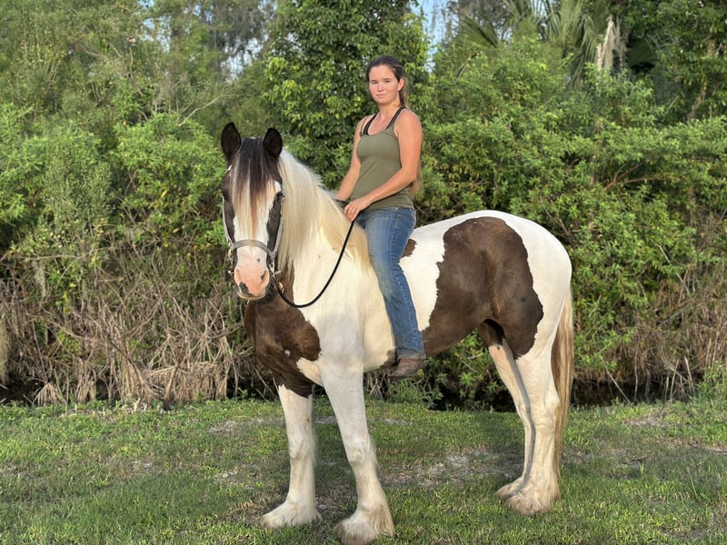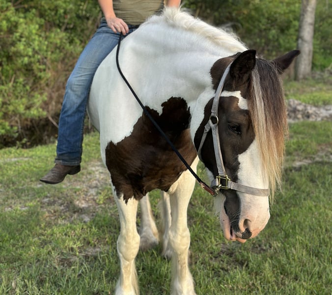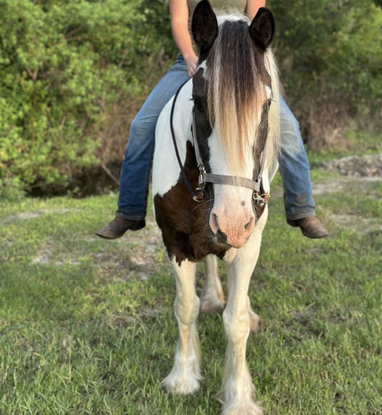 Born September 20th, 2017, Willow is a 15.3 hh black and white Gypsy Vanner x Clydesdale with a unique personality. With her strong, athletic build and incredibly smooth ride, she is perfect for a bigger rider. She moves off the seat, legs, and voice commands. She is smart, willing, and responsive. With her calm demeanor and confidence, she is amazing in the arena or out on a trail ride. She has been ridden around all sorts of animals, traffic, farm equipment, and bikes, and does wonderfully. She is an easy keeper and is happy in a stall or out in a pasture. She is barefoot and is current on Coggins, shots, and trimming. With her being as sweet as they come, she loves spending time with her rider and enjoys being groomed, as well as doing good for clipping. She is great with other horses and any other animals. Willow aims to please, gets along with everyone, and is looking for her perfect partner. Whether you want a reliable trail companion, a fun show horse, or just a sweet best friend to love on, she's ready to step into that role. Asking $18,000. If would like more information, photos, images, or would like to schedule a time to come see her, please send me a message. Located in Bunnell, FL. I am willing to haul to most of Florida if compensated.