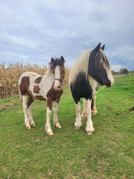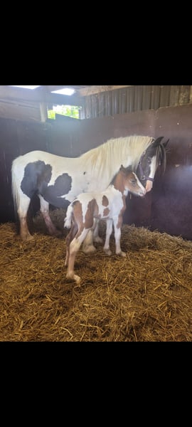 Deze lieve meid mag opzoek naar haar toekomstig 5* huisje! Bella-Rosa is een bruinbonte tinkermerrie. Ze is bij ons geboren op 8 juni 2025. Haar moeder is onze Ice, zij meet 1m50 en haar vader is de goedgekeurde dekhengst Fellow's Captain van de Gorterstraat (laatste foto). Ice en haar veulen werden vorig jaar gekeurd tot 1ste premie en Ice werd ook nog ster merrie en dagkampioen! We wouden ook met Bella naar de keuring gaan, maar deze werd helaas afgelast. Bella is een lief veulen met een leuk karaktertje. Ze kijkt een beetje de kat uit de boom, maar eenmaal ze jou kent krijgt ze geen genoeg van de kriebels en hinnikt ze naar je in de weide. Ze is gewend 24/7 in de weide te staan met haar mama en contact met soortgenoten. Voor nu mag ze nog even genieten bij haar mama en vriendjes op de weide, maar ze mag stilaan opzoek naar haar toekomstig huisje! Bella is voorzien van een chip en paspoort, regelmatig ontwormd en heeft kennis gemaakt met de hoefsmid. Beide ouders testen negatief op pssm1, waardoor ook Bella pssm1 vrij is. Bella-Rosa vd Sterrenhoeve is te bezichtigen in Diepenbeek (Belgisch Limburg). Voor meer info stuur gerust een pb!