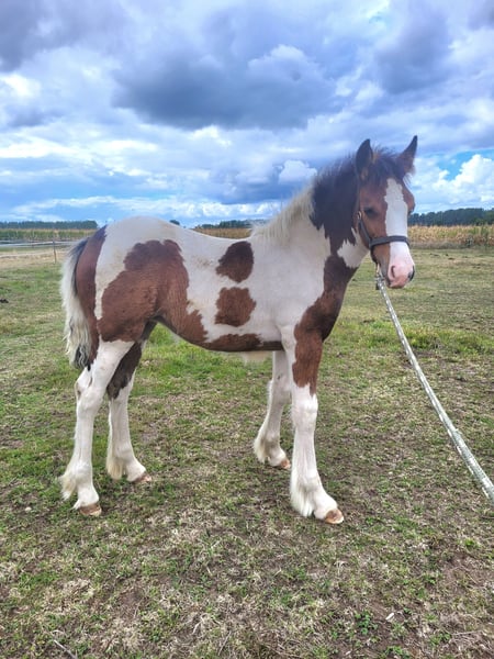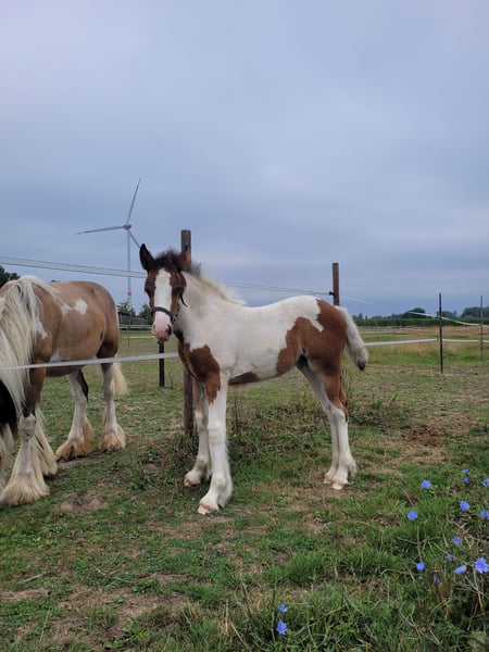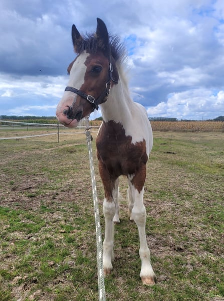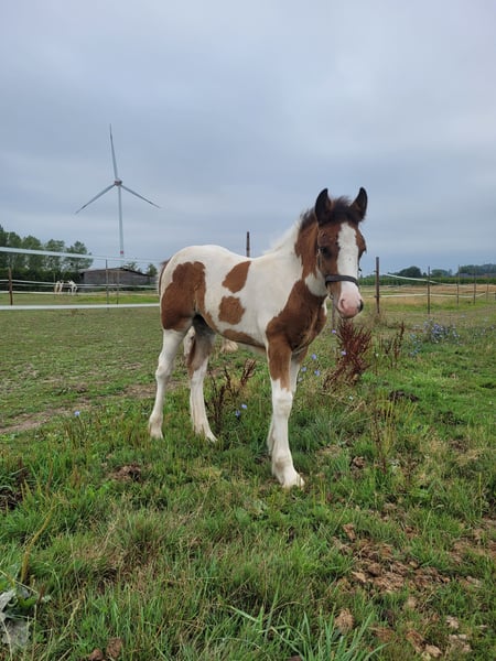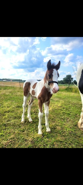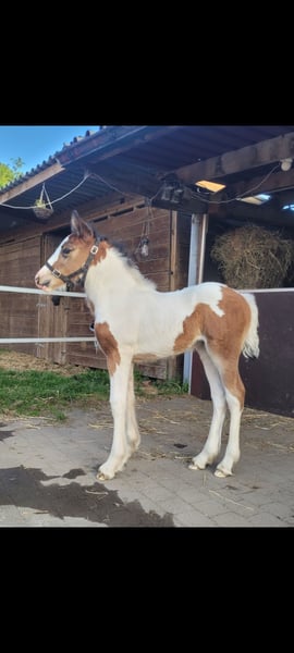 Dieses liebe Mädchen sucht ihr zukünftiges 5-Sterne-Zuhause! Bella-Rosa ist eine braun-gescheckte Tinker-Stute. Sie wurde bei uns am 8. Juni 2025 geboren. Ihre Mutter ist unsere Ice, die 1,50 m groß ist, und ihr Vater ist der zugelassene Hengst Fellow’s Captain von der Gorterstraat (letztes Foto). Ice und ihr Fohlen wurden im letzten Jahr mit der ersten Prämie bewertet, Ice wurde außerdem noch als Ster-Merrie gekört und Tageschampion! Wir wollten auch mit Bella zur Körung gehen, doch diese wurde leider abgesagt. Bella ist ein liebes Fohlen mit einem freundlichen Charakter. Sie ist anfangs etwas vorsichtig, doch sobald sie dich kennt, kann sie kaum genug von Streicheleinheiten bekommen und wiehert dir in der Weide zu. Sie ist daran gewöhnt, rund um die Uhr mit ihrer Mutter und Artgenossen auf der Weide zu stehen. Für den Moment darf sie noch bei ihrer Mama und ihren Freunden auf der Weide bleiben, doch langsam ist es Zeit, ihr zukünftiges Zuhause zu suchen! Bella ist gechippt, hat einen Pass, ist regelmäßig entwurmt und hat Kontakt mit dem Hufschmied gehabt. Beide Eltern sind negativ auf PSSM1 getestet, somit ist auch Bella frei von PSSM1. Bella-Rosa vd Sterrenhoeve kann in Diepenbeek (Belgisch-Limburg) besichtigt werden. Für weitere Infos schicke gern eine private Nachricht!
