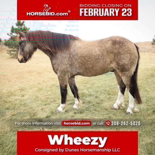 💎 𝐓𝐇𝐄 𝓓𝓲𝓪𝓶𝓸𝓷𝓭 𝐒𝐇𝐎𝐖𝐂𝐀𝐒𝐄 💎 Happening now thru MONDAY | FEBRUARY 23rd - Available EXCLUSIVELY on HorseBid's website! For more details and to register visit: www.Horsebid.com CONSIGNOR CONTACT: Dunes Horsemanship LLC 308-262-5020 LOCATION: Thedford, NE BREED: Gypsy cross REGISTERED: No REGISTERED NAME: Wheezy COLOR: Buckskin HEIGHT: 13.2 AGE: 4 GENDER: Gelding Wheezy is a four year old Gypsy cross with just enough feather and foot to make him look fancy, without all the upkeep that comes with the full blood gypsies! He stands 13.2 and his feet are big enough to make some quarter horses blush! He is currently giving his best impression of a wooly mammoth, but he sheds out into a dark buckskin in the spring and hangs onto those big pretty dapples! Nowhere in my plans did I have offering Wheezy written down, and believe me when I say, it breaks my heart to let him leave, but he is simply too good to keep hidden away here in these hills when he will bring so much joy to a family needing something safe, sound, and reliable. Wheezy walks out like a big horse and has drug a handful of calves at brandings this spring, gathered pastures as the sun came up, and meandered through town this summer. He knows his leads, is starting to get his flying lead change figured out, has a fancy little spin, and is nice and soft in either a bridle or just a halter. He will cross water, loads and unloads with ease, and would halter himself if he had thumbs. He is an absolute pet and loves to be in your pocket any chance he gets. Though he is young, he is an old soul and has never once left me feeling unsafe. Brush the snow off his back and crawl on. He will get you to and from safe and sound! I truly feel he would be suitable for anyone ready to step up from that old faithful to a young and eager yet SAFE gelding. Wheezy is still perfecting his neck rein, but he is the PERFECT project for your little one who is ready to finish their own horse their way, without the risk of starting a colt from scratch. He has a fantastic foundation and is ready for his next family. He has packed kids around some in the arena and is ready to find his forever family with hopefully a handful of kids to teach to love horses! Wheezy has been an absolute joy to have and anyone who is lucky enough to bring him home, will be certain to never find another like him! As with any of our horses, please bring him back at any time for a refresher should you ever feel the need, or just to brush off the cobwebs after a long winter. We want nothing more than for Wheezy to be loved and enjoyed by his new family and we we will go above and beyond to make sure he find his forever! Please reach out with any questions you may have or to come take him for a spin! Tess Chytka Dunes Horsemanship LLC 308-262-5020