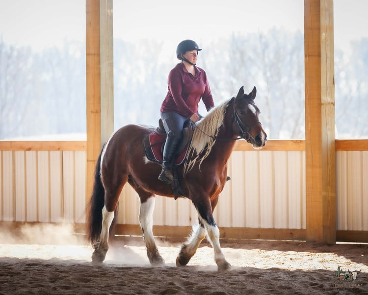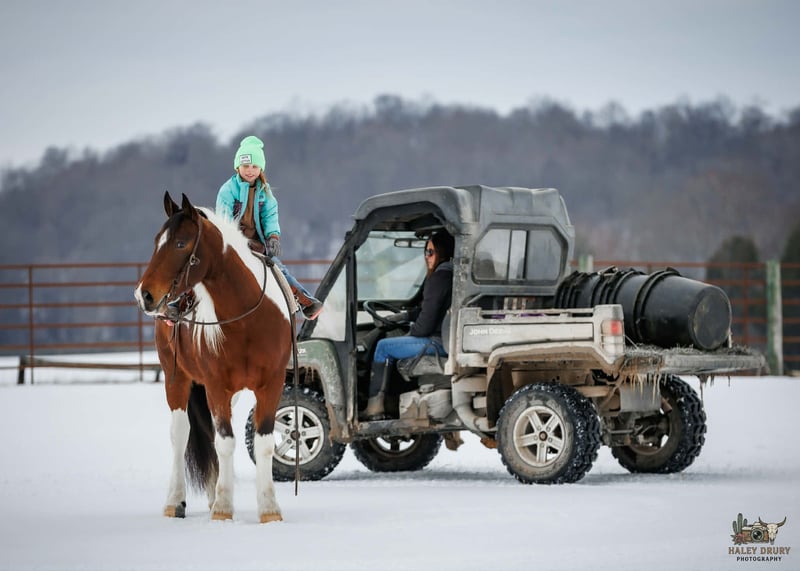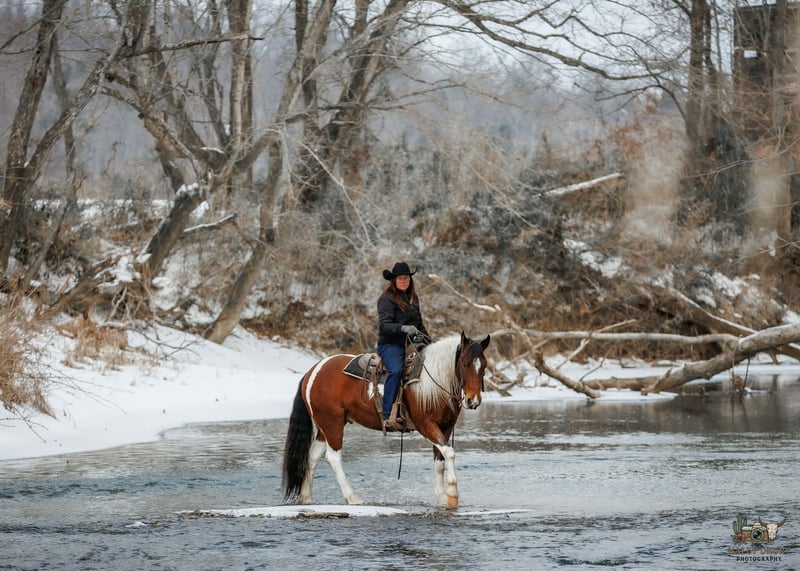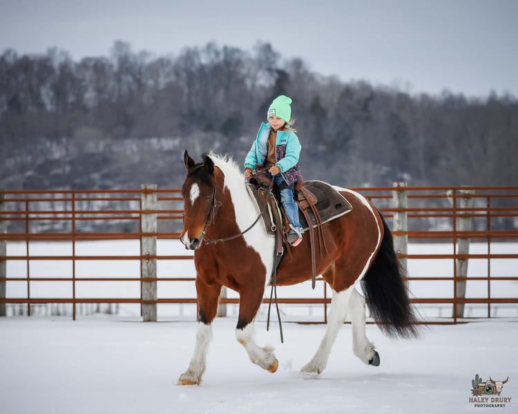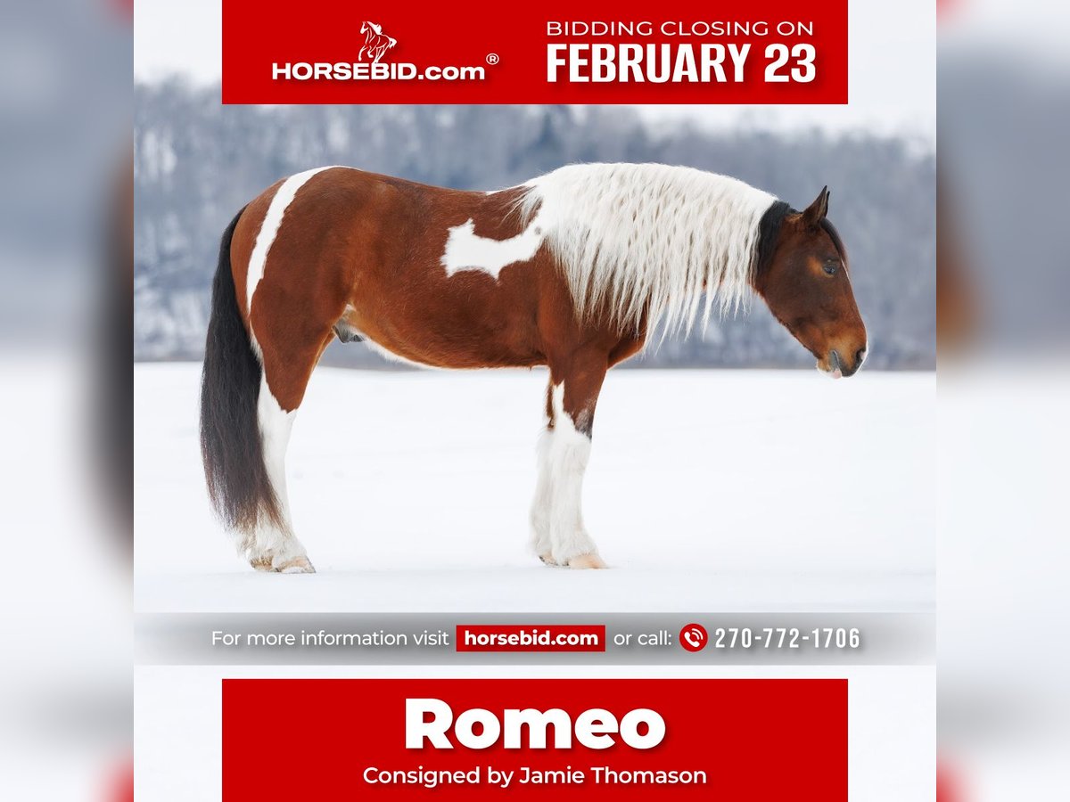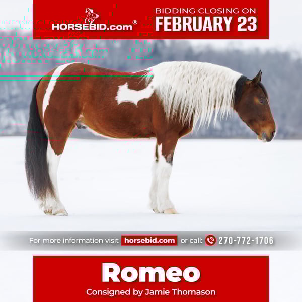 💎 𝐓𝐇𝐄 𝓓𝓲𝓪𝓶𝓸𝓷𝓭 𝐒𝐇𝐎𝐖𝐂𝐀𝐒𝐄 💎 Happening now thru MONDAY | FEBRUARY 23rd - Available EXCLUSIVELY on HorseBid's website! For more details and to register visit: www.Horsebid.com CONSIGNOR CONTACT: Jamie Thomason 270-772-1706 LOCATION: Auburn, KY BREED: Gypsy/Quarter Horse Cross REGISTERED: No REGISTERED NAME: ROMEO COLOR: Bay Tobiano HEIGHT: 14.3 AGE: 4 GENDER: Gelding The kind of horse that reminds you why you fell in love with horses in the first place. Fun, dependable, and a family favorite, Romeo is the one everyone reaches for, whether it’s a quick evening ride or a weekend adventure. With plenty of real-world exposure, he’s seen the sights and handles new experiences with a steady mind. A true all-around horse. He transitions easily between disciplines and is suitable for a wide variety of riders. Romeo is a 4 yr old, Gypsy/Quarter Horse Gelding, standing at a rider friendly 14.3 hands. A versatile partner ready to fit just about any program. Out on the trail, Romeo is the definition of calm and confident. Surefooted and steady, he’s incredibly mindful of where he places his feet and never takes a bad step. He navigates steep inclines, crosses water willingly, and handles rough, uneven terrain with total composure. We’ve ridden him in snow and on ice with zero issues, he stays careful and balanced in all conditions. He’s a true point-and-go type, naturally more “whoa” than “go,” and is just as content riding out alone as he is in a group. Riders of varying ages & skill level have confidently enjoyed him both on the trail and at home. In the arena, Romeo is a natural with a comfortable walk, trot, and canter, carrying himself in a rhythmic, balanced frame. With the lift of your hand & a cluck Romeo sidepasses over to the mounting block. He picks up his leads, stays uncomplicated, and is forgiving of inexperienced cues, making him a wonderful lesson horse prospect. He has been started over crossrails. Shows a natural ability to find his distance to a fence & has the enthusiasm and potential for more scope. I feel he truly enjoys the job. Around the farm, Romeo has gathered cattle, remains unbothered by stock dogs and other livestock, is accustomed to ATVs and farm equipment. Traffic and town safe, he’s even carried the flag without hesitation. Romeo is a pleasure to own. Romeo currently stalls at night and enjoys turnout during the day. He does well in the pasture with others, always easy to catch. Keeps an exceptionally neat stall. Amazing feet, has always been barefoot on a regular trim schedule. Stands well for the farrier. Healthy & maintained on an all forage diet. Easy to load & haul. Romeo easily adapts to an everyday program, but also remains the same with time off. No matter where you take him….down the trails, to work on the ranch, or into the arena, Romeo shows up the same dependable partner every time. Safe enough for the family, talented enough to enjoy in multiple disciplines, and honest in every setting. Romeo is the tried and true reliable kind that’s hard to find. A true once-in-a-lifetime horse ready to be someone’s forever partner. If anyone has additional questions or would like to meet Romeo prior to adding him to your family, feel free to reach out! Romeo sell a current on all cares, PPE’s welcome, & we can assist in arranging transportation to anywhere!