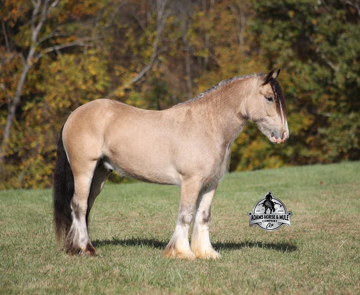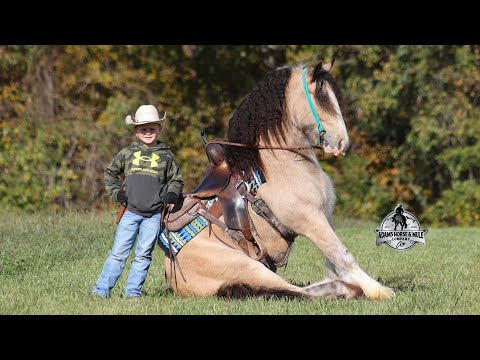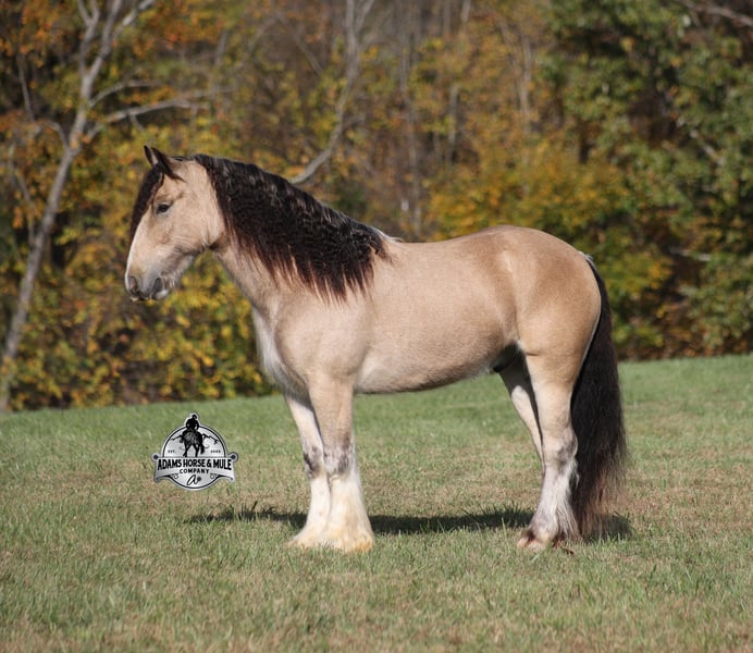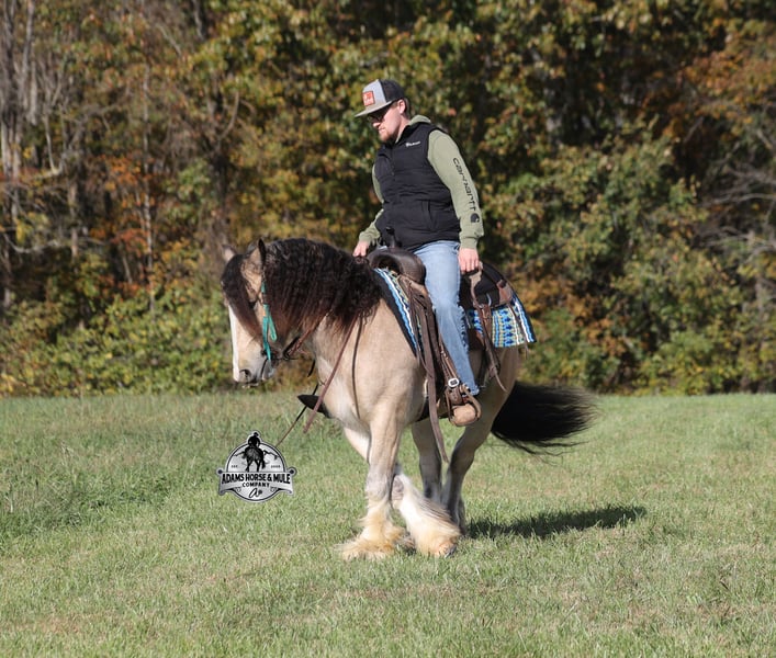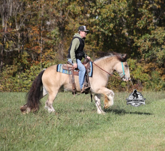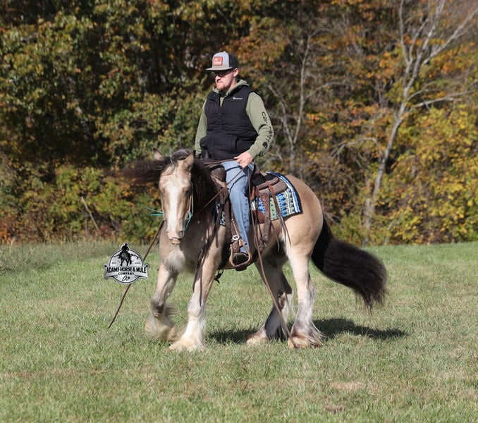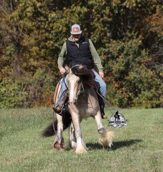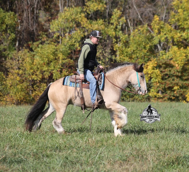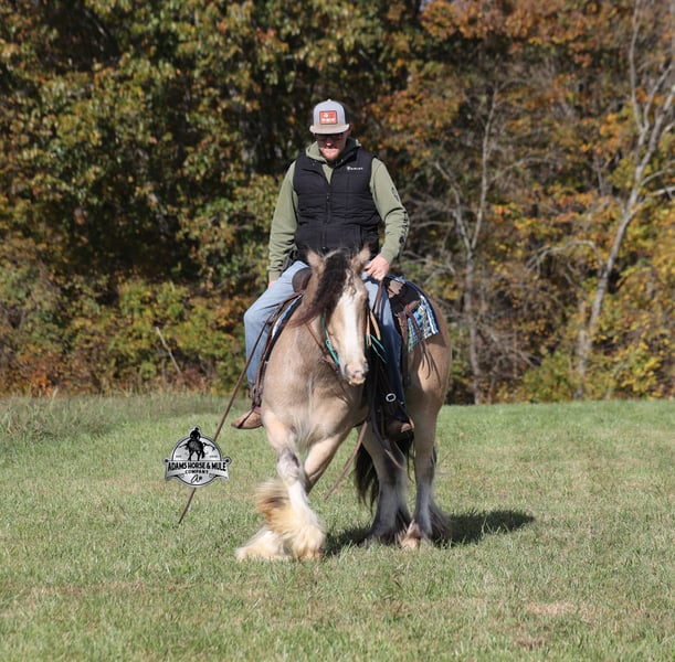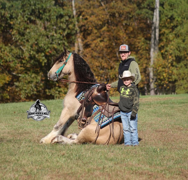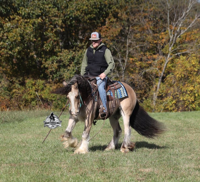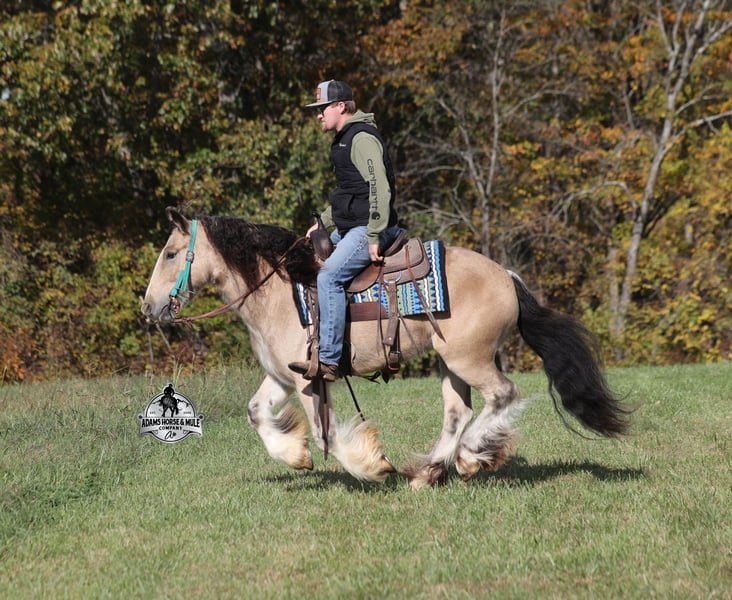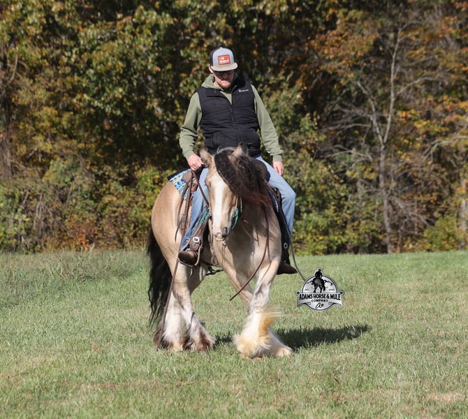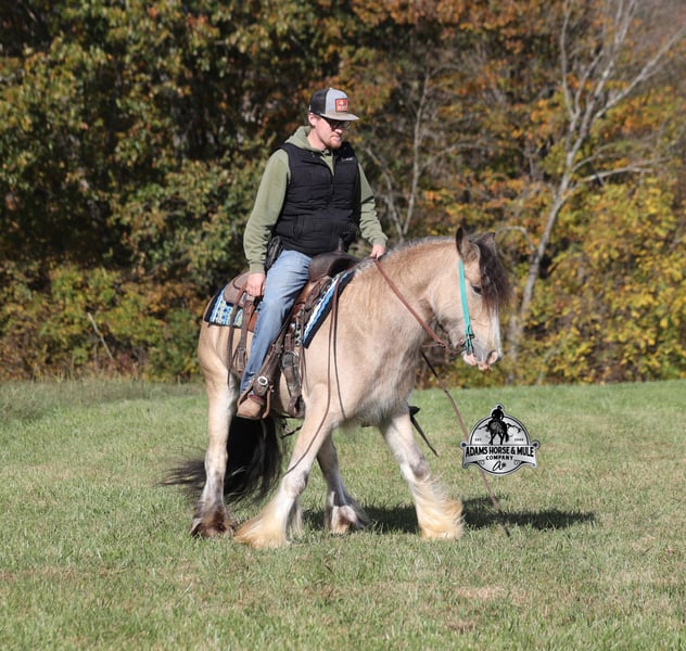 Go to visit our website for more pics and a video www.AdamsHorseAndMuleCo.com AHAMC has been in the horse business and sold horses over the internet since 2005. We have a long track record of success with hundreds of happy customers. We work hard to match riders with the correct horses and specialize in beginner safe, family friendly horses that have been used and checked out by our family! We can set up transportation anywhere in the US and look forward to working with you.This guy has the WOW factor!!! Sparklin Gold Rush aka Spark is a stout built, 2020 Model, registered Gypsy Vanner, gelding standing around 14hh and he is a rare buckskin color with lots of feathering! He is one cool looking guy! Not only does he look cool, he has all of the other boxes checked as well… he is Mr. Personality, as friendly as they come and loves attention. Spark has been in the program for the last year and has completed the natural horsemanship training and he also knows some tricks, he will lay down and set on his rump. Spark has been ridden down the highways and he is traffic safe. In addition to riding he also drives! Spark is great on trails and he will cross creeks, ditches, logs and navigate rough rocky areas. He has a smooth jog, a VERY VERY nice easy to set lope and a good stop. Spark is the best fanciest trained Gypsy that we have had and he has been in reining training. He spins circles both ways and backs with ease! He has been exposed to all kinds of wildlife such as deer or turkey or other animals like cows or dogs and will go anywhere that he is asked too. He has been ridden many miles in the mountains and encountered every obstacle possible on the trail. He will go up or down even the steepest slopes, across deep creeks, over downed trees, and over all types of rough terrain while still being sure footed. Spark is not cinchy, cold backed, does not crib or weave. Spark is a once in a lifetime type of horse that you will love for years to come!!! Feel free to call Eric 606-308-2461 with any questions.