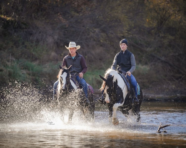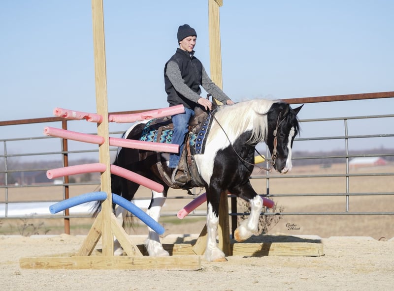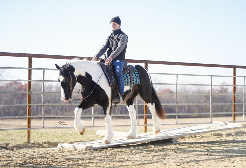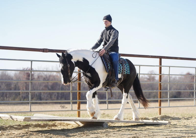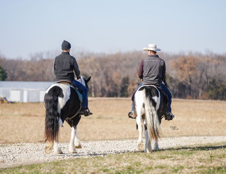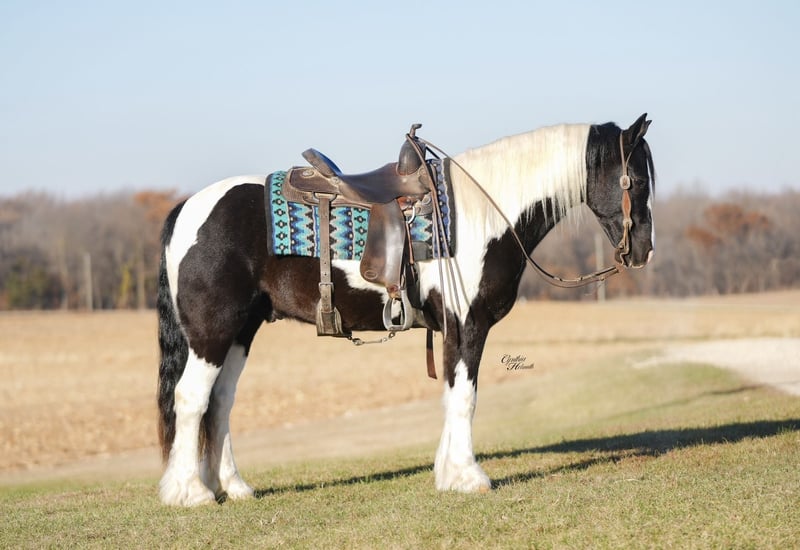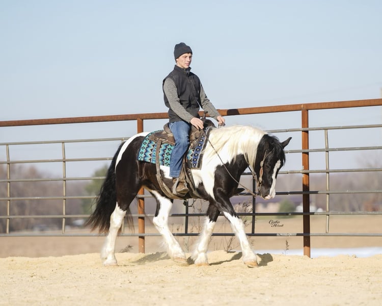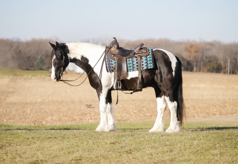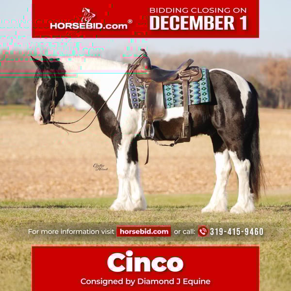 ⚜️ 𝓽𝓱𝓮 𝐇𝐨𝐫𝐬𝐞𝐦𝐚𝐧'𝐬 𝓢𝓱𝓸𝔀𝓬𝓪𝓼𝓮⚜️ Happening now thru MONDAY | DECEMBER 1st - Available EXCLUSIVELY on HorseBid's website! For more details and to register visit: www.Horsebid.com CONSIGNOR CONTACT: Diamond J Equine 319-415-9460 LOCATION: Fairbank, IA BREED: Gypsy cross REGISTERED: No COLOR: Black and White Paint HEIGHT: 14.3 AGE: 4 GENDER: Gelding Cinco is a 4 year old Gypsy/Percheron+Morgan cross gelding. He is broke to ride and drive, single and double. He stands 14.3 hands high and is the perfect size for both adults and children. He has been ridden extensively in the arena and has lots of outside miles on the trail as well. He walks, trots, and lopes a nice circle, and is pretty to watch. He goes through the trails with ease crossing bridges, going through water, and over logs without any problems. He will ride out alone or with other horses. Cinco drives just as nice as he rides! He has been driven a lot in a team, and does well by himself as well. He matches very well in a team with his 7/8ths brother, Seis, who is also available. Please contact Jonas at 319-415-9460 with any questions!