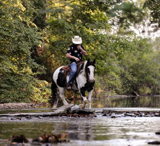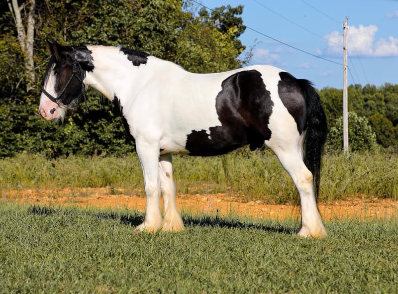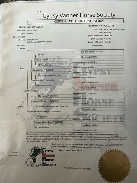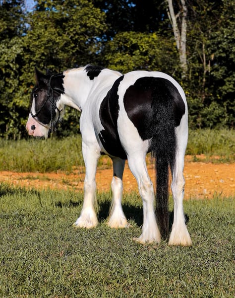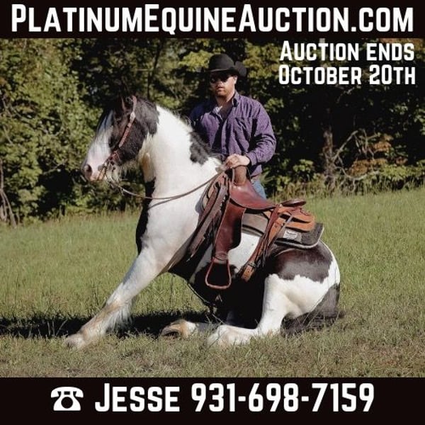 ONLINE AUCTION Place your bids at www.PlatinumEquineAuction.com Starting Bid $3500 Auction ends October 20th, 2024 Need a new saddle? Check out White Rock Saddles on our website or Facebook! Aurora’s Atlas (ATLAS) is a registered Gypsy Vanner (GVHS) 4yr old gelding who is an own son of SD Silver Dollar and he is possibly the coolest and gentlest gelding I have ever had the pleasure of owning. He is truly broke enough for anyone to ride and has seen / done more than most 15yr old horses have ever done. Atlas has the kindest heart and biggest personality you will find in a horse and aims to please you in whatever you are doing! He is one hand broke, picks up his leads, W/T/C, side passes / backs with ease, lays down for mounting and loves to be bathed / groomed. We have done everything you can imagine on him from trail riding, obstacle courses, roped light calves, and even coon hunted on. If you are looking for a True Gypsy that will suit the whole family and is SAFE and SANE then come check out our boy Atlas. For more information on Atlas call Jesse Thomas 931-698-7159 Located in Santa Fe, TN. ONLINE AUCTION Place your bids at www.PlatinumEquineAuction.com Starting Bid $3500 Auction ends October 20th, 2024 Need a new saddle? Check out White Rock Saddles on our website or Facebook!