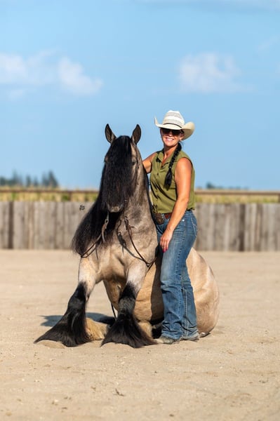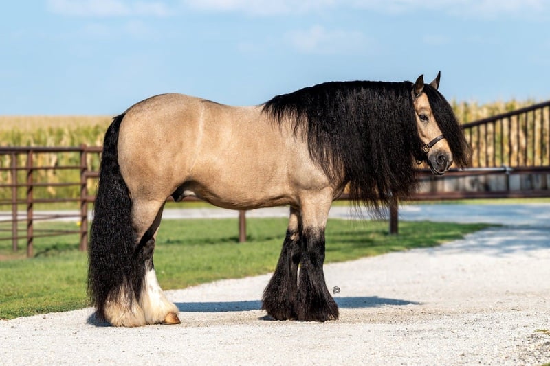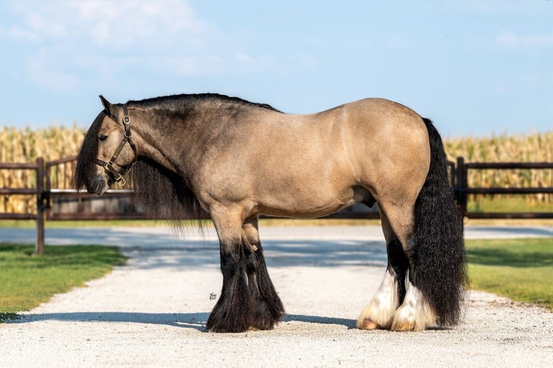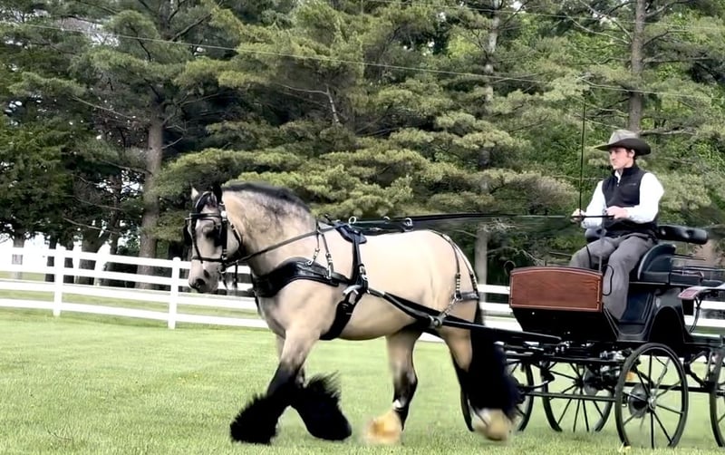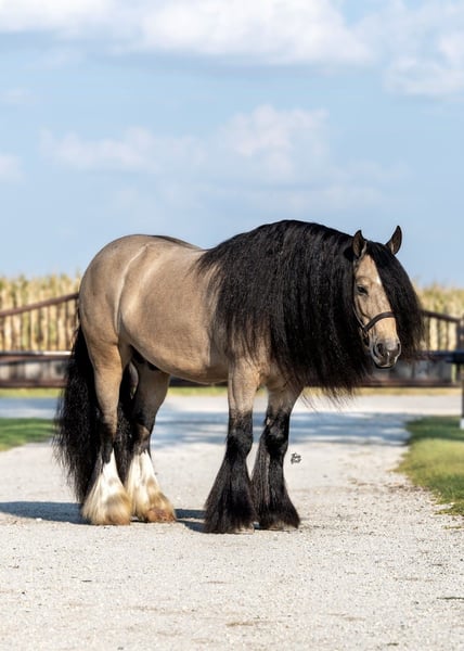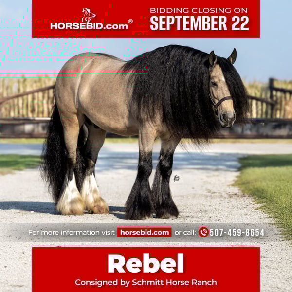 🍁𝒕𝒉𝒆 𝐅𝐀𝐋𝐋 𝑺𝒑𝒆𝒄𝒕𝒂𝒄𝒖𝒍𝒂𝒓🍁 Happening now thru MONDAY | SEPTEMBER 22nd - Available EXCLUSIVELY on HorseBid's website! For more details and to register visit: www.Horsebid.com CONSIGNOR CONTACT: Schmitt Horse Ranch 507-459-8654 LOCATION: Holland, Iowa BREED: Gypsy Horse Association REGISTERED: Yes REGISTERED NAME: The Rebel COLOR: Buckskin HEIGHT: 14.1 AGE: 8 GENDER: Gelding Rebel is a breathtaking 14.1 hand buckskin Gypsy Vanner gelding with an exceptional temperament and eye-catching presence. Trained to lay down on command and sit like a dog, he’s as fun and unique as he is beautiful. Rebel is truly puppy-dog gentle—he loves attention, is easy to catch, and is always a pleasure to handle and ride. Whether you’re in the arena, navigating trail obstacles, or driving through town, Rebel is calm, reliable, and traffic-safe in all environments. He’s been extensively ridden and driven, making him a versatile addition to any family or program. This gelding is family-friendly and safe. He’s well-desensitized, non-reactive, and takes everything in stride with a level head. In the arena, Rebel knows his leads, responds well to leg cues, and pivots both directions. He has all the foundational training you’d expect and carries himself with grace and style. Rebel stands perfectly for the farrier, has excellent bone structure and strong, healthy feet. He stalls without issue and gets along well with other horses in the pasture. While he may not be the typical type we have in our program, Rebel’s stunning looks and gentle personality made him impossible to pass up. He’s the ideal family horse—whether you want to ride, drive, or simply enjoy his companionship. Sound, no health issues, current on deworming, farrier, and coggins. For more information give Riley a call at (507) 459-8654. Rebel is located in Holland, Iowa. We offer free board within a reasonable time frame after purchase until shipping arrangements can be made.