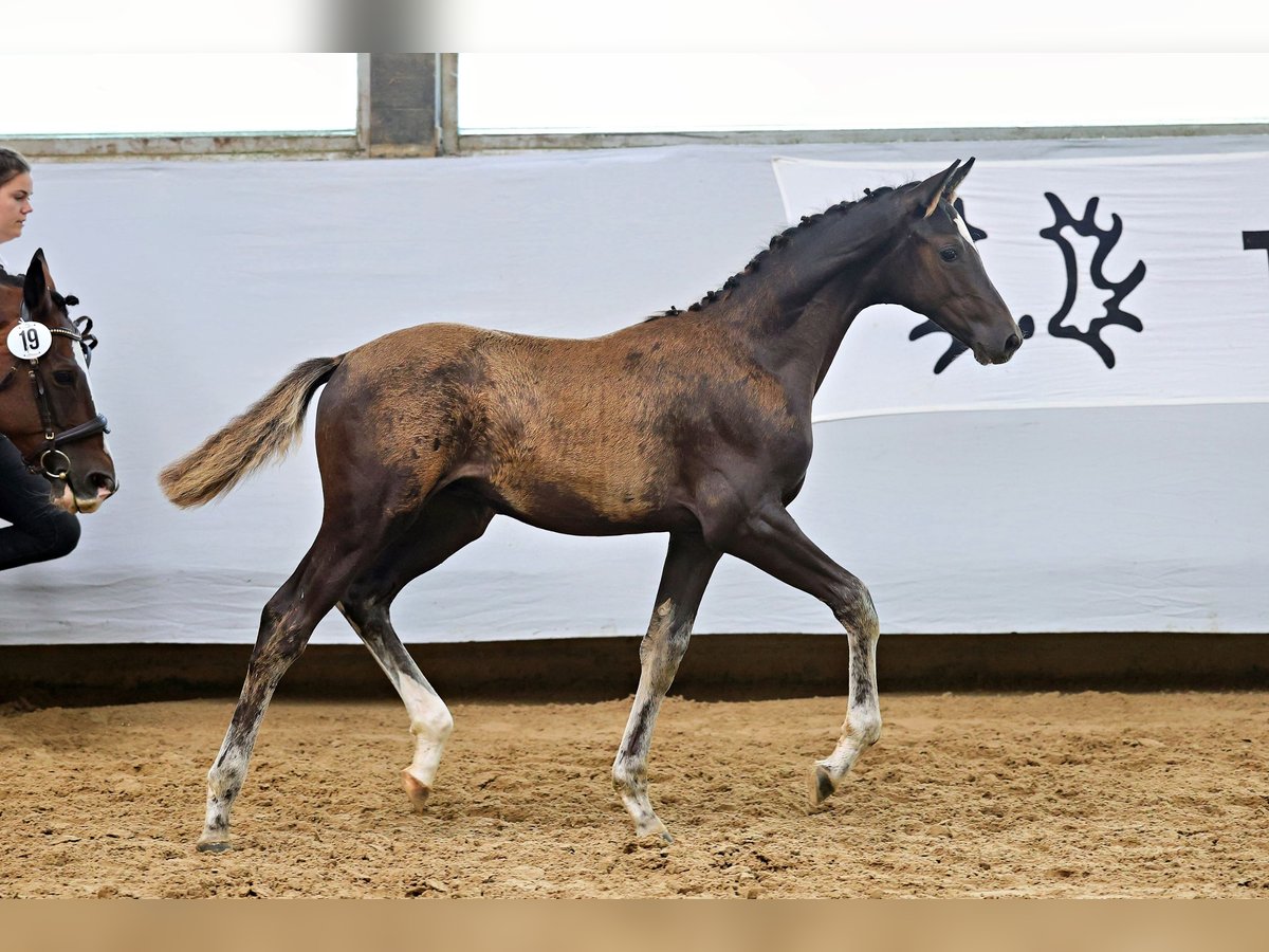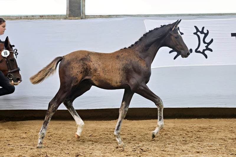 Le père Haffruf est l'un des représentants les plus prometteurs de la jeune génération de étalons Trakehner. Les raisons de cette évaluation se combinent très bien dans ce poulain né le 21 avril 2025. Longiligne et moderne dans la silhouette de son corps remarquable. En même temps, il est typique et expressif. Stable et correct dans son fondement. Grand et confortable dans son corps avec la meilleure posture et développement. L'imposante et toujours portée en montée avant-main laisse déjà présager que le cavalier aura beaucoup à attendre de lui. La mère Illuster associe avec Münchhausen et King Arthur deux étalons Trakehner gagnants de Grand Prix dans une succession directe de générations, basés sur un très célèbre lignage de pur-sang. Malgré, ou peut-être à cause de cette haute exigence de pedigree, le progrès de l'élevage avec ce poulain réussi est littéralement en montée.