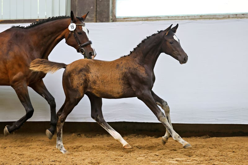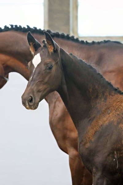 Der Vater Haffruf ist einer der hoffnungsvollsten Vertreter der jungen Trakehner Beschäler-Generation. Und die Ursachen für diese Einschätzung vereinigen sich sehr schön in diesem Hengstfohlen vom 21. April 2025. Langbeinig und modern in der Silhouette des bedeutenden Körpers. Dabei typecht und ausdrucksvoll. Stabil und korrekt im Fundament. Großlinig und komfortabel im Körper bei bester Haltung und Entwicklung. Die imposante und stets bergauf getragene Vorhand lässt schon heute erwarten, dass der Reiter viel vor sich haben wird. Die Mutter Illuster verbindet mit Münchhausen und King Arthur zwei bis Grand Prix gewinnreiche Trakehner Siegerhengste in direkter Generationenfolge auf der Basis eines sehr prominenten Vollblutstammes. Trotz oder gerade wegen dieses hohen Pedigree - Anspruchs geht der Zuchtfortschritt mit diesem gelungenen Hensgtfohlen im wahrsten Sinne des Wortes bergauf.