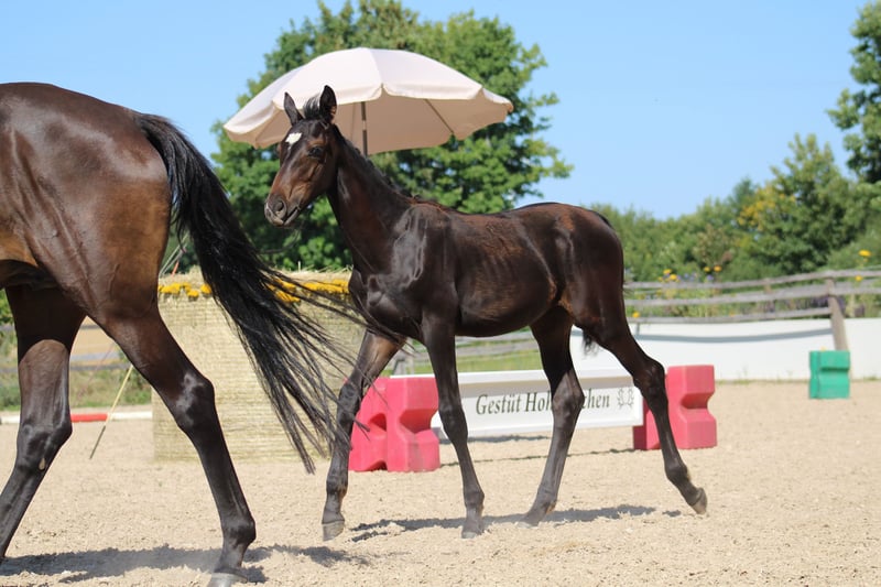 Unser kleiner Vertigo ist ein bewegungsstarkes, sehr sportlich geprägtes Versprechen auf höhere Aufgaben. Vielseitig gezogen, vereint er Springvermögen mit guter Bewegung. Gesund und korrekt. Gerade der Schritt und Galopp sind mit einer Bewertung von 8,0 Punkten hervorzuheben. Insgesamt erreichte Punktzahl 54. Seine Zeichnung und Ausdruck, machen den Kleinen zu einem echten Blickfang. Wir geben uns sehr viel Mühe dabei unsere Fohlen von der Trächtigkeit bis hin zum Absetzten gesund aufzuziehen. Unsere Fohlen genießen ausgiebigen Weidegang vom ersten Tag. Gutes Fütterungsmanagement, Parasitenmanagement und regelmäßiges Vorstellen beim Hufschmied sind ebenso gegeben wie routinemäßiges Vorstellen beim hauseigenen Tierarzt. Unsere Fohlen befinden sich derzeit im schonenden Absetzprozess und können frühestens Ende Oktober final abgesetzt werden (gerne später). Gerne ziehen wir den kleinen Hengst auch weiter für Sie auf. www.gestuethoheneichen.de oder auf instagram: gestuethoheneichen Wir haben noch weitere Hengstfohlen und Jährlingsstuten im Angebot!