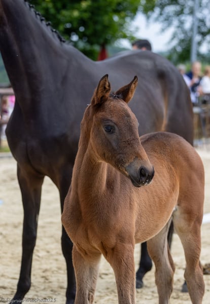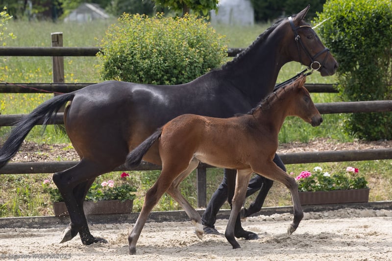 A filly of a very special kind and a successful breeding debut of the reserve champion Times Square, who completed a superior performance test. As a premium foal with great prospects, she possesses all the talents to follow in the footsteps of her famous family and ancestors: highly noble, charmingly feminine, and very well-proportioned in the significant parts of her body, she moves lightly, with diligence and rhythm, and excels in every phase. Her grandmother Inschi's Songline, from whom she is bred in close line breeding (3rd/2nd), was reserve champion in the competition for the title of annual champion mare and is part of the silver collection of Trakehner broodmares; thus, on her mother's side, she is related to her grandfather Integer, but also to the licensed stallions Imperativ, Idealerweise, and Iniesta, and especially to the champion mares Ibiza and Inselkind, as well as the current annual champion mare Ibiza's Highlight.