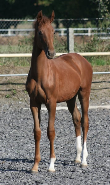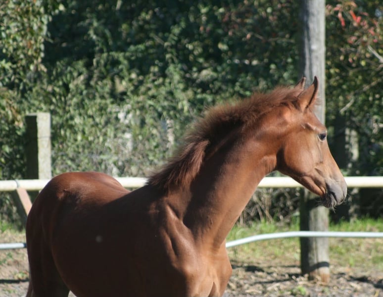 Élevée et sportive, la jument alezane Soramira TN, née le 26 mars 2025, est parfaitement adaptée au concours complet. Son père, le vainqueur du HLP en concours complet et étalon d'élite Le Chevalier (également vainqueur de Nurmi), ainsi que sa mère, la prämienstute Soraya TN, une fille de Domhardt – Graf Lindenau, renforcent son profil. Les raisons de sélection sont également d’ordre génétique : elle provient de la rare mais noble lignée de Walküre von Diakon, qui a déjà produit d’exceptionnels chevaux pour l’élevage du Trakehner, tels que Sachsenkönigin ou Samland, lauréate du Championnat des juments du Nord. Sur le plan sportif, la génétique joue également en sa faveur, avec des ancêtres tels que Cavallieri xx, Ramzes x, Marduc, Abu Afas ox et à plusieurs reprises le très estimé cheval de performance Modus xx. Soramira, fidèle à ses origines blood, se montre d’une noblesse exceptionnelle, avec un port de tête élégant, de longues jambes et de très bonnes allures, notamment un galop remarquable. La jument alezane a d’ailleurs reçu une prime de présentation pour sa naissance de la part de la direction de l’élevage.