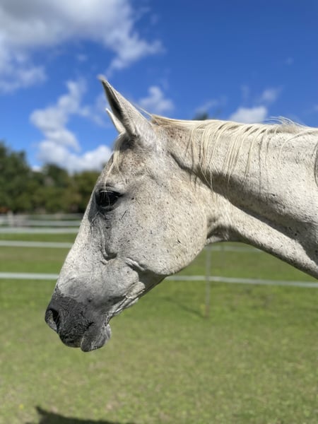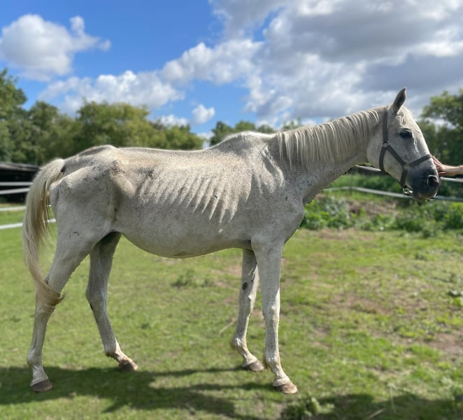 Die 23 Jahre alte Schimmelstute ist halfterführig, schmiede- und verladefromm und sehr ausgeglichen. Sie wurde aus ihrer ursprünglichen Haltung in einer tierschutzrechtlichen Maßnahme fortgenommen. Sie ist leidet unter einer chronischen Atemwegserkrankung, die mit einer sportlichen oder züchterischen Nutzung nicht vereinbar ist. Momentan ist sie jedoch nahezu symptomfrei. Sie diente auch als Zuchtstute und hat 3 plausibel nachvollziehbare Nachkommen. Wahrscheinlich ist sie auch geritten worden, dies ließ sich allerdings nicht nachvollziehen und wurde aufgrund der Atemwegserkrankung und des Ernährungszustandes nicht getestet. Momentan erholt sie sich gut und ist munter. Sie hat einen liebenswerten sanften Charakter und ist sehr umgänglich und verträglcih mit anderen Pferden. Sie stammt aus einer Offenstallhaltung. In Obhut wurde sie gegen Tetanus geimpft und entwurmt. Eine Zahnbehandlung ist angeraten. Wir suchen für die Stute nach ihrer Regeneration von ihren alten Haltungsbedingungen ein schönes Zuhause, in dem sie Ihren Lebensabend verbringen kann.