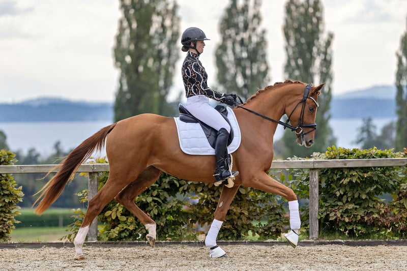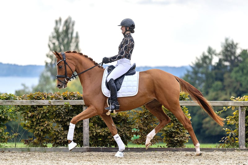 In traumschönem Stil, vornehm und bewegungsvirtuos tanzte Sonnenschein in souveräner Darstellung auf einen hochdotierten Prämienrang in der starken Konkurrenz der ZSE Bayern 2025. Die Vollschwester der Auktionselite Sonnenröschen (NMS ‘23/73) ist mit einer Topgenetik geschmückt, in der 2. Generation finden die prämierten Grand-Prix-Hengste Le Rouge und Lowelas (Kanada) zusammen. Dazu knüpft sie enge verwandtschaftliche Bande mit dem Bewegungswunder Sanderas (NMS ‘22/04) und den hochdekorierten Stuten Senorina und Sensburg. Aus einem vom besten Blut geprägten Zweig der berühmten Scherezad-Dynastie und nah verwandt mit dem im S-Parcours hart geprüften Vererber Schenkendorf (UK). Die Stute wird anlässlich des Trakehner Hengstmarktes am 28.112025 bei einer Auktion versteigert, alle Informationen finden Sie unter: https://bid.trakehner.auction/auctions