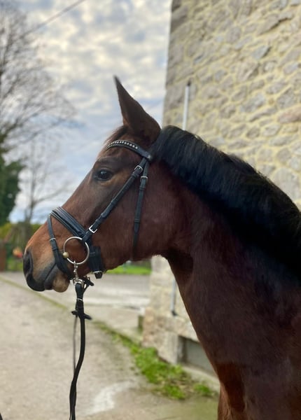 Daily est une jeune jument sympathique et proche des humains, que j'ai moi-même élevée et qui a grandi en troupeau. Elle est simple et a du caractère, n'ayant rencontré aucun problème lors de son débourrage. Son père, Sturmpfeil, est double vice-champion au Championnat fédéral de concours complet, et son père maternel, Goldschmidt, est un étalon élite du Verband Trakehner. Elle est encore en croissance et va encore gagner quelques centimètres en taille. Ses allures de base sont bonnes et régulières, le pas étant particulièrement remarquable. Je souhaite pour Daily une formation complémentaire et je peux bien imaginer qu'elle serait également adaptée comme cheval de famille grâce à son bon caractère.