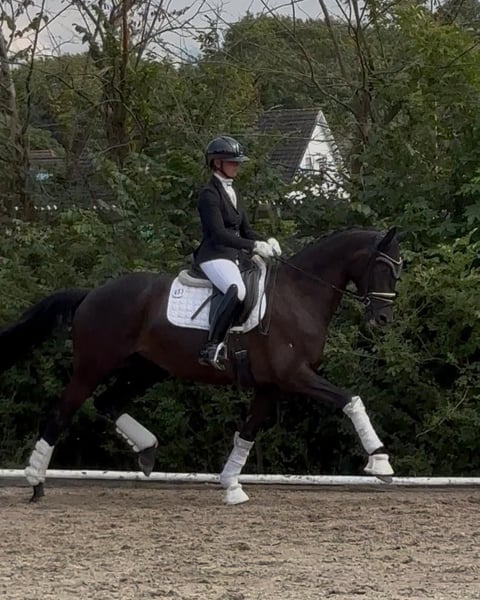 For sale is an exceptionally high-quality, strong-minded, and highly rideable 5-year-old Trakehner mare, who is equally interesting for sport and breeding. The beautiful, black-brown daughter of the top stallion Millennium from a proven Elfado dam was secured as a foal through the auction at the Trakehner Federal Tournament and grew up robustly in the best upbringing with plenty of turnout. Gently started under saddle, she impressed early on at her first competitions and showcased her quality impressively: With nearly consistent scores of 9, she crowned her performance at the Trakehner Federal Tournament 2024 with the title of Vice Trakehner Champion and also received the nomination for the German Bundeschampionat in Warendorf. This year, at the age of 5, she secured the title of Vice Champion in the Schleswig-Holstein State Championship. Currently successful in Dressage Horses L, this talented young mare, measuring 168 cm, is in excellent development. Particularly noteworthy are her already very good traverses in trot and canter, which impressively underline her potential for the higher dressage classes. Due to her loving, uncomplicated, and rideable nature, "Kadenza" is not only a highly interesting dressage horse for top sport but also an ideal junior and amateur horse that brings joy every day and offers great future potential. For more information, please contact Pierce Lotz (+49 172 310 46 12).