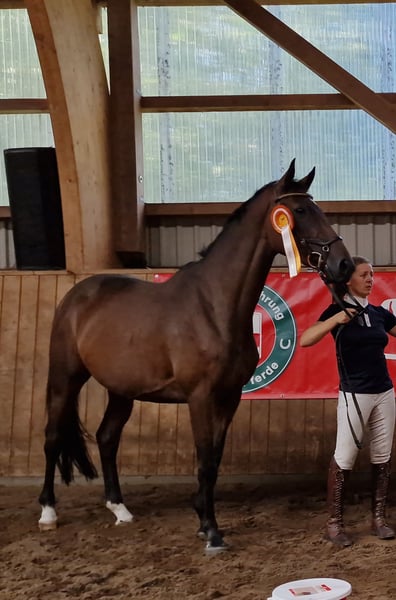 Top Gracy was born at our stud farm, carefully reared and broken in on spacious pastures. Top Gracy passed a mare performance test in August 2024 with the following grades All basic gaits (walk, trot, canter) 8.0 Rideability with the judges and external rider 8.5 Free jumping 8.5 In the subsequent cross-country section, Top Gracy received an 8.0 for performance scope and a 7.5 for canter ability. A skillful mare who has had no health problems to date. She can be registered with the Trakehner Verband without any restrictions. Even in East Prussia, the mating of half-bloods was considered a recipe for success! Her paternal half-sister will compete at the 2024 Bundeschampionat for eventing horses. Her maternal half-sister is successful in eventing.