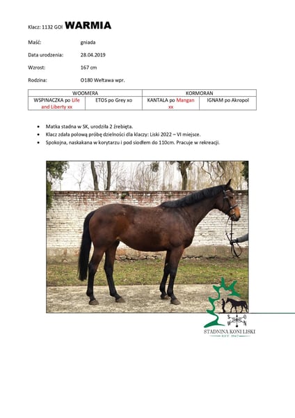 Stute hat die Leistungsprüfung für Zuchtstuten bestanden. Sie hat in der Zuchtstation zwei Fohlen geboren. Ruhig im Wesen, arbeitet mit Kindern und Jugendlichen, geht ins Gelände und springt bis 110 cm. Gesund. Stute vom Züchter: Gestüt Liski E-Mail: konie.liski@interia.pl