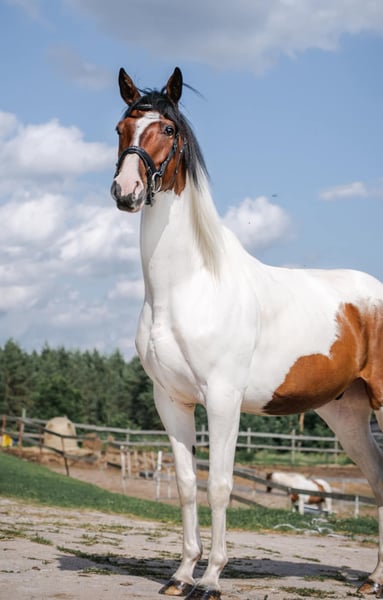 9-jähriger farbiger Trakehner (165 cm) Wallach, er wurde von einem Profi angeritten, später nur sehr wenig als Freizeitpferd geritten, sprang nur "Kreuze" mit Kindern, danach wurde er 6 Monate von einem professionellen Dressurausbilder geritten, aber danach habe ich ein Baby bekommen und jetzt verbringt er seit über einem Jahr nur Zeit in einem Paddock.