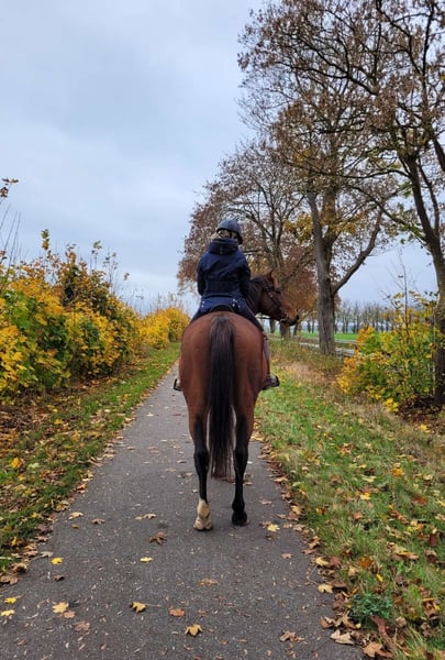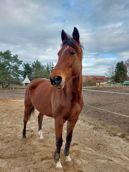 Con grande tristezza, il nostro cavallo Trakehner Diego è in vendita. Non si tratta di una vendita urgente e si preferirebbe un prolungamento della sua permanenza in questo maneggio. (A Zülow) Diego è un gigante molto amichevole, dolce e tranquillo. È con noi da 5 anni, così come la sua leggera debolezza nel portare il peso. Nonostante ciò, è non solo diligente nel lavoro a terra, ma anche sotto sella e nel bosco. Per motivi personali, non ci è più possibile dargli l'attenzione e l'addestramento che merita e di cui ha bisogno. Poiché vogliamo solo il meglio per lui, sarebbe bello se potesse rimanere in questo maneggio, dove si sente molto a suo agio. Qui ci sono grandi pascoli, una sala di equitazione, un grande campo da equitazione, oltre a un'area di toelettatura e un lavaggio, così come un vasto terreno per le passeggiate, che offre molta varietà. Inoltre, i gruppi sono separati per sesso, il che evita tensioni e stress. Tra gli accessori ci sono un saddle da dressage, attrezzatura per la toelettatura e ulteriori equipaggiamenti. Se interessati, vi preghiamo di contattarci. (Ulteriori foto disponibili su richiesta)