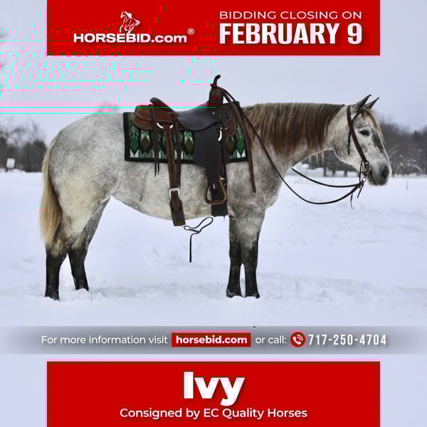 ❤️🔥𝑩𝒆 𝑴𝒊𝒏𝒆 𝐒𝐄𝐋𝐄𝐂𝐓❤️🔥 Happening now thru MONDAY | FEBRUARY 9th - Available EXCLUSIVELY on HorseBid's website! For more details and to register visit: www.Horsebid.com CONSIGNOR CONTACT: EC Quality Horses 717-250-4704 LOCATION: Beaver Springs, PA BREED: Crossbred REGISTERED: No REGISTERED NAME: Ivy COLOR: Gray HEIGHT: 15 AGE: 4 GENDER: Mare Introducing Ivy! She’s the kind that’s hard to find! Safe, Reliable, and Trustworthy! She’s quality you don’t have to explain! Ivy is a 4yr old Gray Draft Cross Mare. She stands approximately 15hh tall built to last a lifetime. Ivy is super gentle with an in your pocket personality. She has all the looks and willing attitude to please! We have ridden Ivy both english and western. She rides in or out of the arena. Ivy is soft in the bridle or ride her bridleless! She will walk, trot, and canter. She picks up her both of her leads and transitions nicely into her gaits. Ivy will spin and slide stop! Ivy has been over some cross rails and small jumps. We have also had Ivy out on the trails. She will go out alone or with others. Ivy will go wherever you point her. She crosses through water and goes over logs. Ivy has also been around excessive amounts of cattle. Ivy stands to be groomed, bathed, saddled, unsaddled, mounted, and to be dismounted from. She’s the kind of horse you wouldn’t mind having in your barn! She’s as pretty as one comes with all the ride! Ivy is 100 % sound. A PPE is welcome at the buyers expense. She will come with a current coggins and health certificate after purchase! For further information regarding Ivy please don’t hesitate to reach out to Carley @ 717-250-4704
