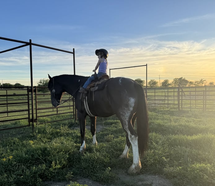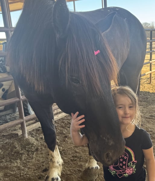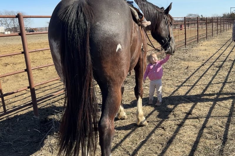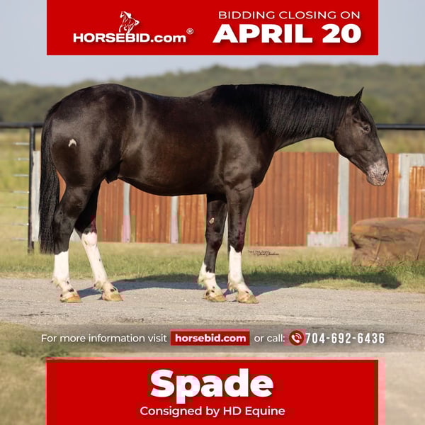 ⚜️𝐭𝐡𝐞 𝓔𝓵𝓲𝓽𝓮 𝐒𝐩𝐫𝐢𝐧𝐠 𝐂𝐥𝐚𝐬𝐬𝐢𝐜⚜️ Happening now thru MONDAY | APRIL 20th - Available EXCLUSIVELY on HorseBid's website! For more details and to register visit: www.Horsebid.com CONSIGNOR CONTACT: HD Equine 704-692-6436 LOCATION: Madill, OK BREED: Draft Cross REGISTERED: No REGISTERED NAME: Spade COLOR: Black HEIGHT: 16.1 AGE: 4 GENDER: Gelding Spade is a 4 year old draft cross gelding standing 16.1 hands, and weighs 1450. He is a well-balanced, easygoing gelding with a quiet demeanor and a kind personality. We have owned Spade for over a year and he has been a pleasure to have in our program. Spade is a gentle giant! He has toted our 4 yr old daughter around at countless rodeos to see the sights. He is safe for her to handle on the ground and is also light enough in the bridle she can guide him where she needs to go. Spade has been hauled and used at summer rodeos to pick up and drag bulls and has also carried flags during grand entries. He has been hauled to the Cowtown Coliseum in Fort Worth, Texas for PBR events and handled the lights and loud fireworks like it was just another day. He is enjoyable to ride outside and is very sure footed on the trails. He confidently crosses logs, ditches, water, and rough terrain without hesitation. Spade is a great choice for someone looking for a steady, confidence building mount, as he is honest, dependable, and uncomplicated. On the ranch, Spade has been used to sort and drag calves. You can work gates on him easily. He is reliable and consistent, whether ridden regularly or given time off. You can saddle him on cold mornings and step off into a trot without concern. Spade rides nicely in the arena as well. He lopes correct circles both directions, gathers up in the bridle, and has a good stop and back. He side passes both ways. He even has a nice turn around. His gaits are smooth and comfortable as well. At home, Spade is a gentleman. He stalls well or fine to turn out with others, simple to catch, stands for grooming and baths, and is excellent for the farrier. Spade is a kind, steady gelding with experience both in and out of the arena, suitable for a variety of riders and programs. Spade would make a great addition to anyones barn, he is so easy and very uncomplicated. He sales 100% sound with clean X-rays. Please feel free to give us a call about Spade!