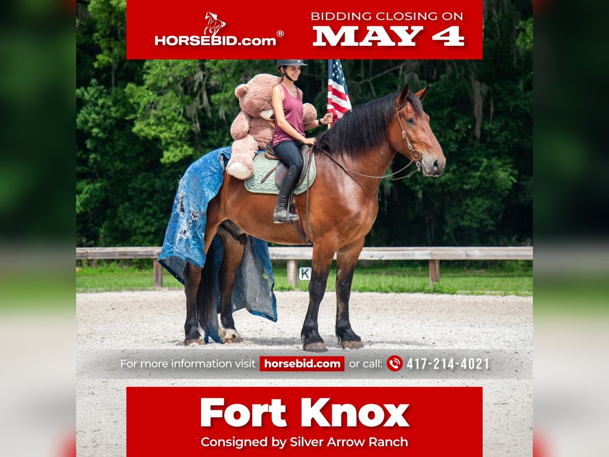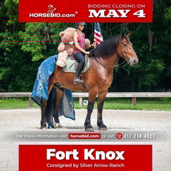 ▪️▫️◾️𝐭𝐡𝐞 𝑴𝒂𝒚 𝐒𝐞𝐥𝐞𝐜𝐭◾️▫️▪️ Happening now thru MONDAY | MAY 4th - Available EXCLUSIVELY on HorseBid's website! For more details and to register visit: www.Horsebid.com CONSIGNOR CONTACT: Silver Arrow Ranch 417-214-4021 LOCATION: Ocala, FL BREED: Draft X REGISTERED: No COLOR: Bay HEIGHT: 18 AGE: 4 GENDER: Gelding ✨ Fort Knox – Locked-In Safe, Solid Gold Kind of Horse ✨ If you’re looking for something truly valuable, meet Fort Knox—a horse that’s every bit as rare and dependable as his name implies. Standing an incredible 18 hands, this stunning bay gelding is impossible to miss. He’s big, bold, and built like a fortress—but underneath it all, he’s as kind and trustworthy as they come. The kind of horse you can feel confident putting your trust in… because with Fort Knox, you know your ride is secure. He’s been ridden Western, English, and bareback, and has seen just about everything. From miles of trail riding to having guns shot off of him, nothing rattles this guy—he stays cool, calm, and collected no matter the situation. Fort Knox has safely carried beginner riders, proving that even though he’s massive, he’s incredibly gentle and forgiving. He takes care of his people like they’re his most valuable asset. On the ground, he’s just as dependable—respectful, easy to handle, and steady. No drama, no nonsense—just a solid horse you can count on every single day. This is the kind of horse you don’t come across often—a true “keep forever” type. With his size, experience, and heart of gold, Fort Knox is an investment you won’t regret. Call Sam 417-214-4021 or KayLynn 660-553-1999