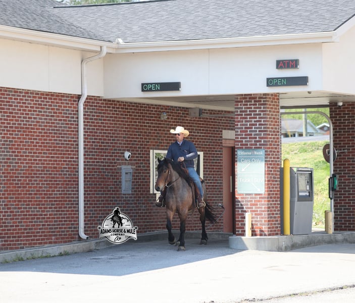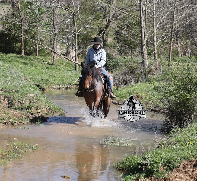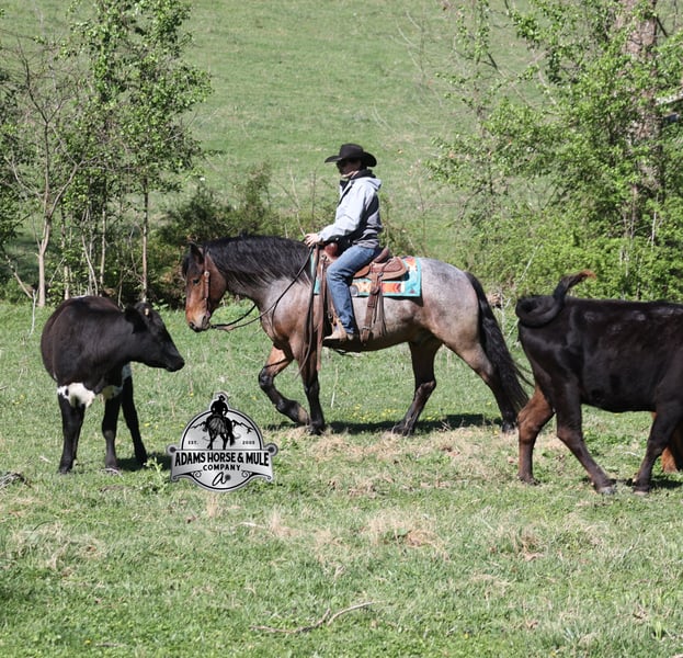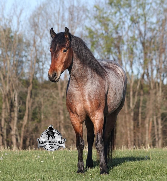Go to visit our website for more pics and video link at www.AdamsHorseAndMuleCo.com AHAMC has been in the horse business and sold horses over the internet since 2005. We have a long track record of success with hundreds of happy customers. We work hard to match riders with the correct horses and specialize in beginner safe, family friendly horses that have been used and checked out by our family! We can set up transportation anywhere in the US and look forward to working with you. Clover is just as sweet as his name suggest! He is an awesome looking 15.2h, Bay Roan Draftcross gelding! He is 5 years old and is a sturdy built horse. Clover came from the same breeding farm that a lot of our draftcrosses come from and with that farm we find the constant quiet, gentle, laid back temperament that makes them such good family safe trail horses! Clover is no exception to that statement as he is a super quiet, gentle, laid back type of horse that is going to suit any rider and help build your confidence. Not to mention he is very friendly as well! Clover can do a variety of things from pulling carriages, to ranch work or trail rides. Clover has been on camping trips, been ridden in several states and has been ridden by all ages of beginners. We took him on a week long trip to Texas and Missouri back in March as an extra for some of our friends (total beginners!!!) to ride around an exotic ranch. Clover saw Bison, Water Buffalo, Emu, Ostriches, Camels, Nilgai, Blesbok, Ibex, Rusa, Corsican, Zebra, and even got chased by a herd of Wildebeest(they are mean little critters!) We even rode on the beach of the Barzos River and across it as well. But nothing phased Clover! When out on the ranch or going down the trails, he will cross creeks, ditches, logs and navigate rough rocky areas. He is safe in traffic safe whether that be trucks or cars. He’s been ridden around the ranch, checked cows and rode fences. Clover moves very smoothly, as he has a nice jog, his lope is smooth as well and he lopes nice circles on a loose rein! He has been ridden English and goes over the jumps with ease. If you want a sweet guy who will be your best friend, Clover will fit the bill! Feel free to call Eric 606-308-2461 with any questions!