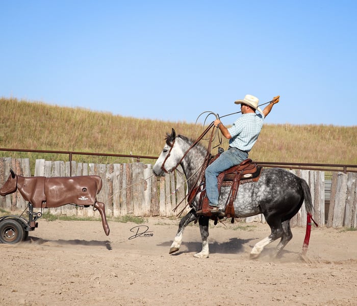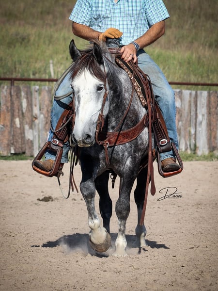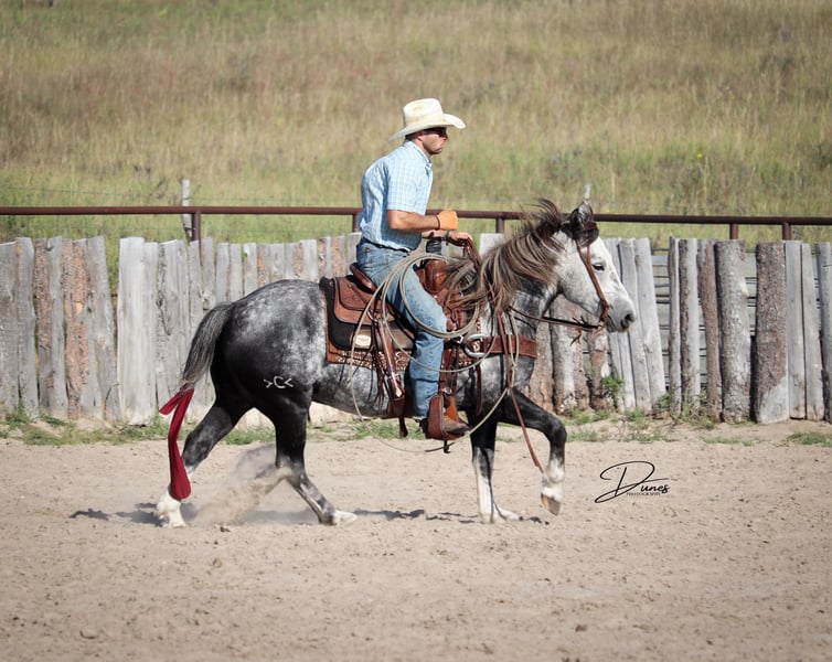 🍁𝒕𝒉𝒆 𝐅𝐀𝐋𝐋 𝑺𝒑𝒆𝒄𝒕𝒂𝒄𝒖𝒍𝒂𝒓🍁 Happening now thru MONDAY | SEPTEMBER 22nd - Available EXCLUSIVELY on HorseBid's website! For more details and to register visit: www.Horsebid.com CONSIGNOR CONTACT: Dunes Horsemanship LLC 308-262-5020 LOCATION: Thedford, NE BREED: Quarter Horse Draft Cross REGISTERED: No REGISTERED NAME: Palmer COLOR: Grey HEIGHT: 14 AGE: 5 GENDER: Gelding Palmer isn’t the kind to go unnoticed! He has dapples on every inch of his handsome bod, and he wears them well! Palmer stands 14 hands tall and is easily 15 hands wide. He is 5 years old but has the resume of a 12 year old! He will be the very first horse to meet you at the gate, regardless of whether he is in a stall or out in a section wide pasture. He is truly a gelding who LOVES the company of his people! He is very user friendly and one who can take a joke for riders who may be less than perfect at mounting gracefully, or who may not have perfect hands. We feel he is suitable for someone who has graduated their old faithful (or two) and are ready for a younger horse who has a few more buttons and a little more pep in their step, but still needing something safe and sane to take care of them. Palmer is the kind you can kick out on pasture in the fall and go grab him in April, saddle tight and leave the barn knowing you will have a great time and get home safe! We have focused most of Palmer’s training in the arena. He is patterned on the barrels and lopes a nice set! He has been hauled some to local play days and exhibitions to see the sights and hear the sounds and taken it all in stride. He has a lead departure that would make a reiner jealous, and the softest cadenced lope to go with it. He will go as fast or slow as you need him to. He is started correct and slow behind the Heel-O-Matic and showing an immense amount of talent with it! We truly feel he could make a seriously competitive junior heel horse or a breakaway horse for a teenager looking to have an easy prospect. We’ve had him really hustle after a calf, then come right back to your hand and almost lope in place he’s so smooth. Palmer is fantastic in town around all the noise and chaos that city life has to offer. From traffic to a train barreling by, he has taken everything in stride and is the confident kind that will take the lead when others are hesitant. We have used Palmer some on the ranch as well. He has drug calves to the fire to brand and gathered and moved cows as well. He has more motor to him on the ranch and is one who can cover the big circle twice and still have gas in the tank. Palmer is barefoot and easy to trim by myself. He is patient with me being meticulous and will stand quietly as long as needed for the perfect pedicure. He is current on all vaccinations, deworming, and is ready to enjoy the fall with his new family! As with any of our horses, a successful relationship between you and one of our horses is paramount. If you ever need, bring him back for a free tuneup at any time! Sometimes the peace of mind just dusting off of cobwebs after a long winter puts your mind at ease and we are happy to help! Please reach out for any questions or to schedule a time to come take him for a spin! We are happy to get any additional specific video or photo you may need to make the bidding process easier! Tess Chytka 308-262-5020